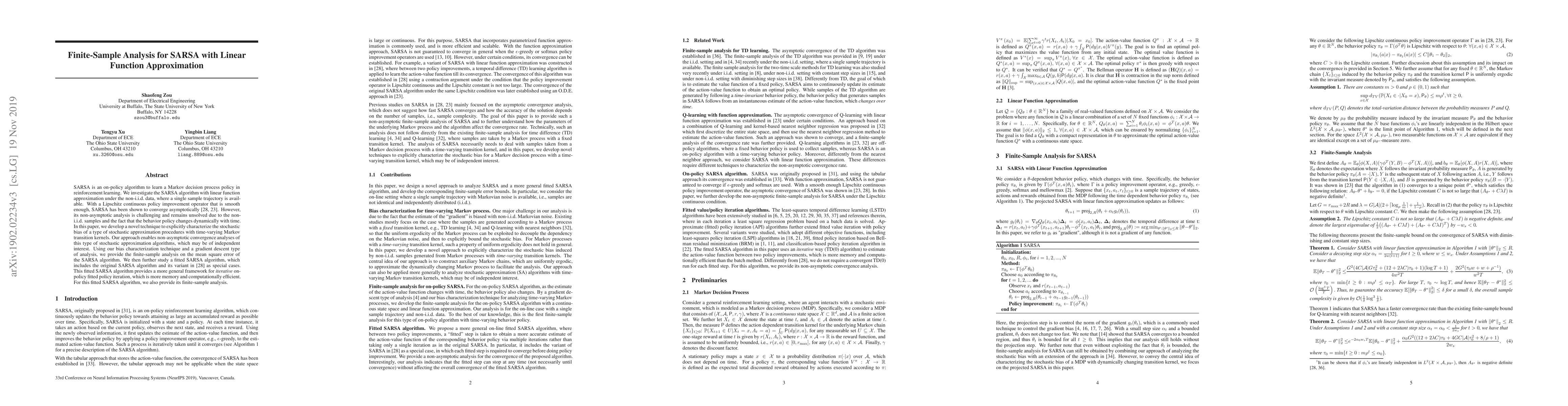 SARSA is an on-policy algorithm to learn a Markov decision process policy in reinforcement learning. We investigate the SARSA algorithm with linear function approximation under the non-i.i.d.\ data, where a single sample trajectory is available. With a Lipschitz continuous policy improvement operator that is smooth enough, SARSA has been shown to converge asymptotically \cite{perkins2003convergent,melo2008analysis}. However, its non-asymptotic analysis is challenging and remains unsolved due to the non-i.i.d. samples and the fact that the behavior policy changes dynamically with time. In this paper, we develop a novel technique to explicitly characterize the stochastic bias of a type of stochastic approximation procedures with time-varying Markov transition kernels. Our approach enables non-asymptotic convergence analyses of this type of stochastic approximation algorithms, which may be of independent interest. Using our bias characterization technique and a gradient descent type of analysis, we provide the finite-sample analysis on the mean square error of the SARSA algorithm. We then further study a fitted SARSA algorithm, which includes the original SARSA algorithm and its variant in \cite{perkins2003convergent} as special cases. This fitted SARSA algorithm provides a more general framework for \textit{iterative} on-policy fitted policy iteration, which is more memory and computationally efficient. For this fitted SARSA algorithm, we also provide its finite-sample analysis.