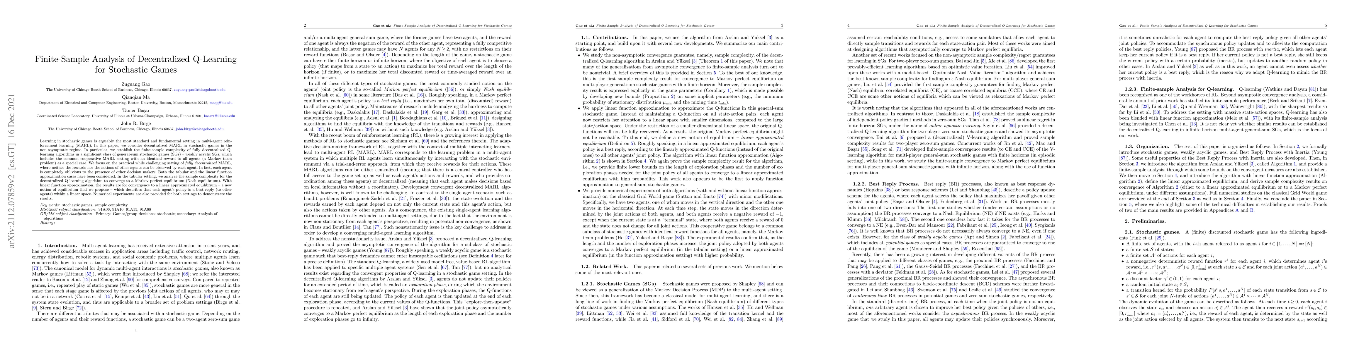 This paper investigates the finite-sample complexity of decentralized Q-learning in weakly acyclic stochastic games, analyzing convergence to a Markov perfect equilibrium in the tabular setting and to a newly defined linear approximated equilibrium with linear function approximation. Numerical experiments validate the theoretical findings.