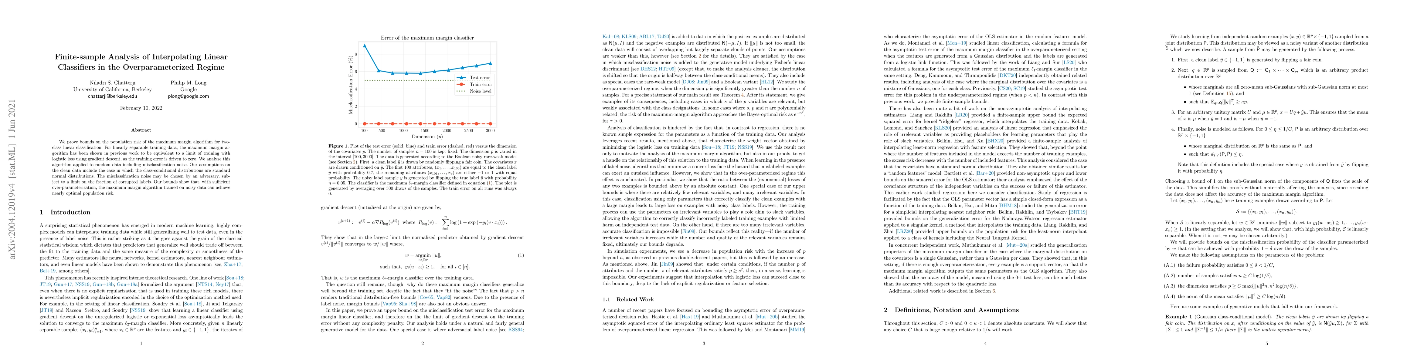 The paper proves that even with noisy data, an overparameterized maximum margin algorithm can achieve nearly optimal population risk, and provides bounds on the population risk for such algorithms.