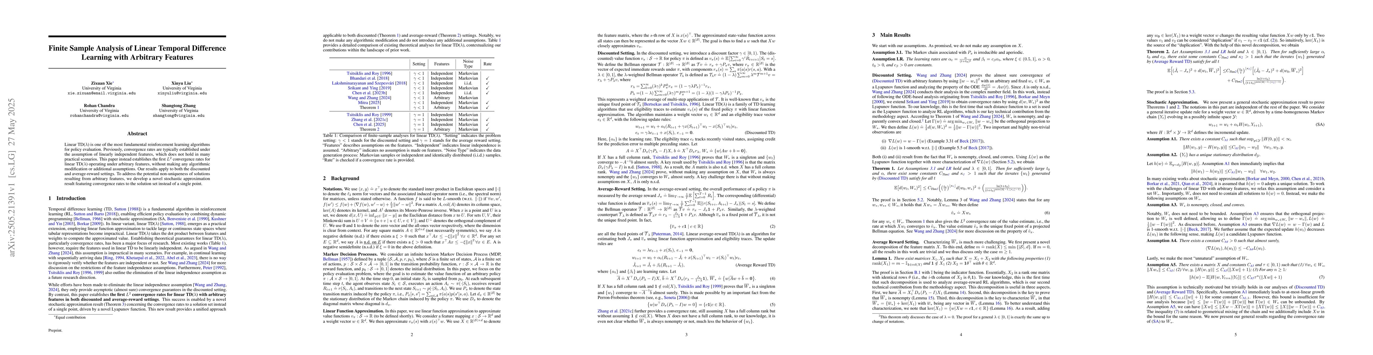 The research establishes $L^2$ convergence rates for linear TD($\lambda$) under arbitrary features, utilizing stochastic approximation with convergence rates to the solution set.