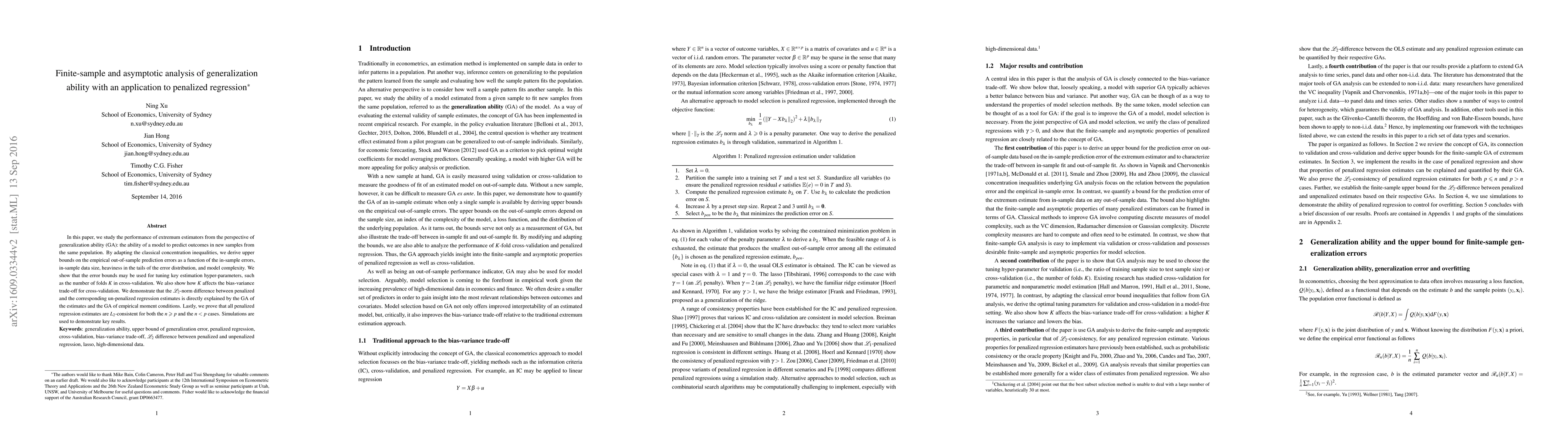 In this paper, we study the performance of extremum estimators from the perspective of generalization ability (GA): the ability of a model to predict outcomes in new samples from the same population. By adapting the classical concentration inequalities, we derive upper bounds on the empirical out-of-sample prediction errors as a function of the in-sample errors, in-sample data size, heaviness in the tails of the error distribution, and model complexity. We show that the error bounds may be used for tuning key estimation hyper-parameters, such as the number of folds $K$ in cross-validation. We also show how $K$ affects the bias-variance trade-off for cross-validation. We demonstrate that the $\mathcal{L}_2$-norm difference between penalized and the corresponding un-penalized regression estimates is directly explained by the GA of the estimates and the GA of empirical moment conditions. Lastly, we prove that all penalized regression estimates are $L_2$-consistent for both the $n \geqslant p$ and the $n < p$ cases. Simulations are used to demonstrate key results. Keywords: generalization ability, upper bound of generalization error, penalized regression, cross-validation, bias-variance trade-off, $\mathcal{L}_2$ difference between penalized and unpenalized regression, lasso, high-dimensional data.