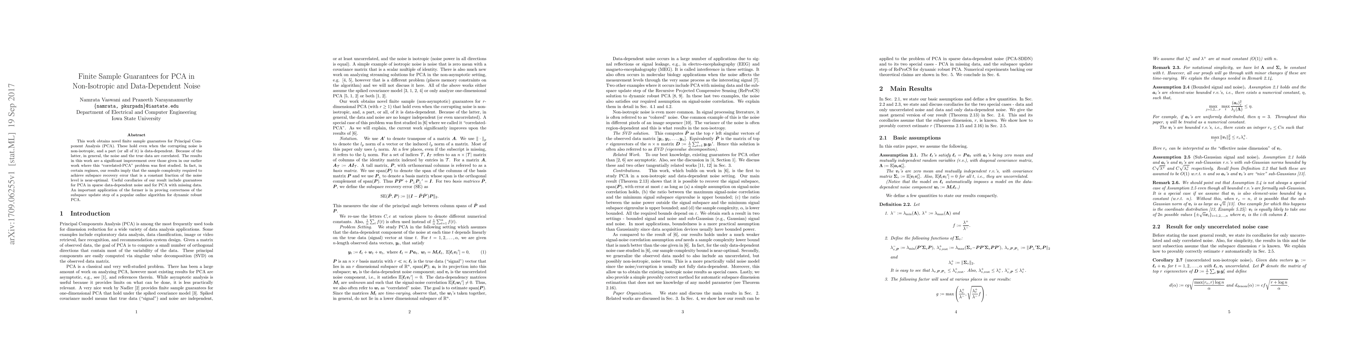 This paper provides improved finite sample guarantees for PCA under non-isotropic and data-dependent noise, showing near-optimal sample complexity for subspace recovery. It also extends the results to sparse data-dependent noise and PCA with missing data, with applications to online dynamic robust PCA.