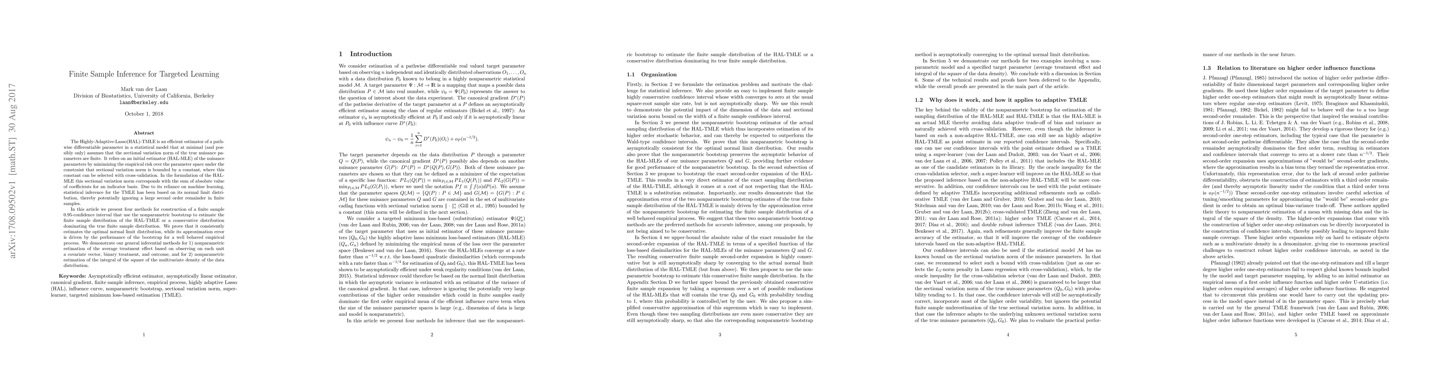 The Highly-Adaptive-Lasso(HAL)-TMLE is an efficient estimator of a pathwise differentiable parameter in a statistical model that at minimal (and possibly only) assumes that the sectional variation norm of the true nuisance parameters are finite. It relies on an initial estimator (HAL-MLE) of the nuisance parameters by minimizing the empirical risk over the parameter space under the constraint that sectional variation norm is bounded by a constant, where this constant can be selected with cross-validation. In the formulation of the HALMLE this sectional variation norm corresponds with the sum of absolute value of coefficients for an indicator basis. Due to its reliance on machine learning, statistical inference for the TMLE has been based on its normal limit distribution, thereby potentially ignoring a large second order remainder in finite samples. In this article, we present four methods for construction of a finite sample 0.95-confidence interval that use the nonparametric bootstrap to estimate the finite sample distribution of the HAL-TMLE or a conservative distribution dominating the true finite sample distribution. We prove that it consistently estimates the optimal normal limit distribution, while its approximation error is driven by the performance of the bootstrap for a well behaved empirical process. We demonstrate our general inferential methods for 1) nonparametric estimation of the average treatment effect based on observing on each unit a covariate vector, binary treatment, and outcome, and for 2) nonparametric estimation of the integral of the square of the multivariate density of the data distribution.
