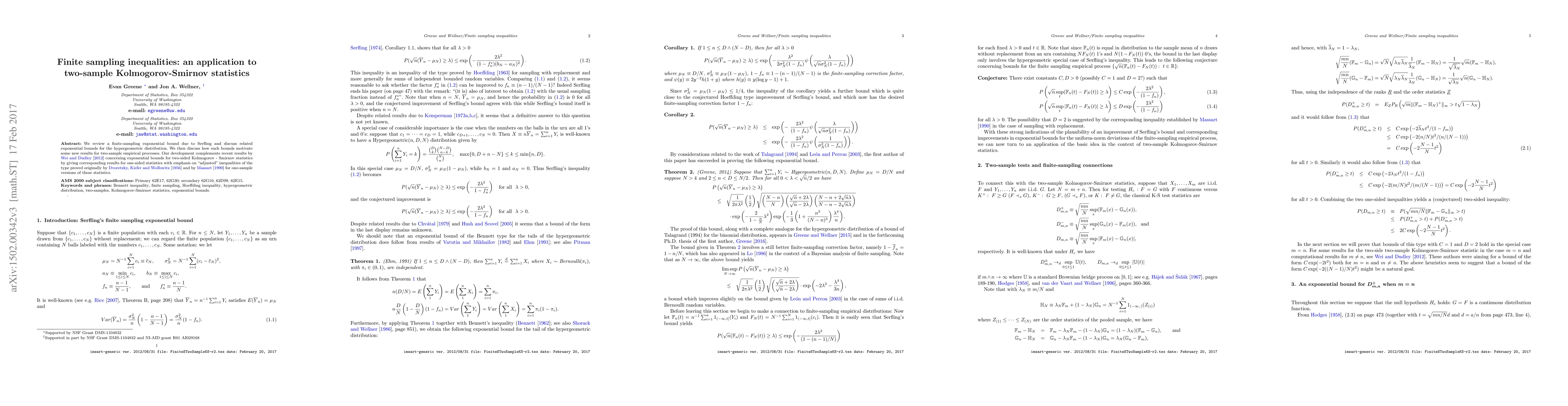 We review a finite-sampling exponential bound due to Serfling and discuss related exponential bounds for the hypergeometric distribution. We then discuss how such bounds motivate some new results for two-sample empirical processes. Our development complements recent results by Wei and Dudley (2011) concerning exponential bounds for two-sided Kolmogorov - Smirnov statistics by giving corresponding results for one-sided statistics with emphasis on "adjusted" inequalities of the type proved originally by Dvoretzky, Kiefer, and Wolfowitz (1956) and by Massart (1990) for one-sample versions of these statistics.