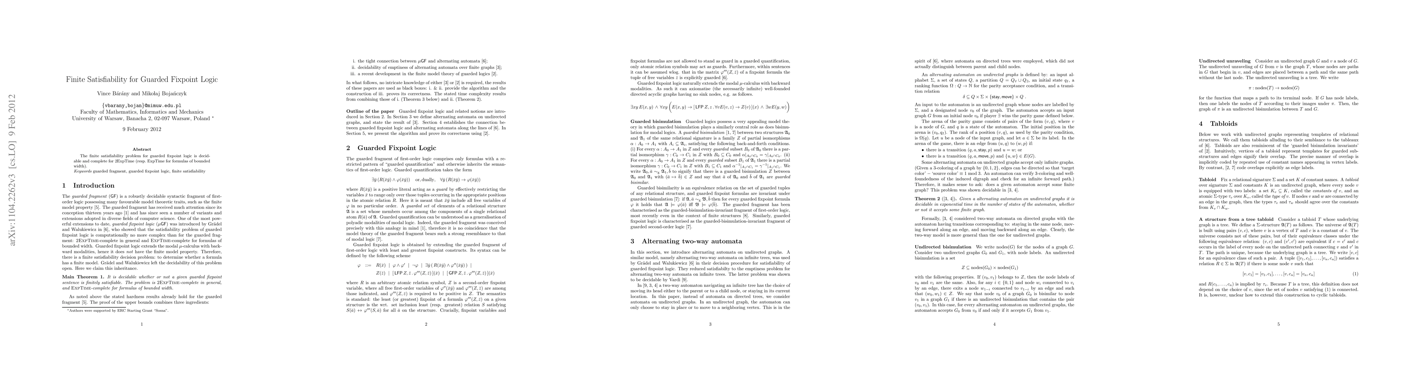 Summary: The paper establishes that the finite satisfiability problem for guarded fixpoint logic is decidable and belongs to the complexity class 2ExpTime (or ExpTime for formulas of bounded width). This result provides a comprehensive understanding of the logic's computational properties.