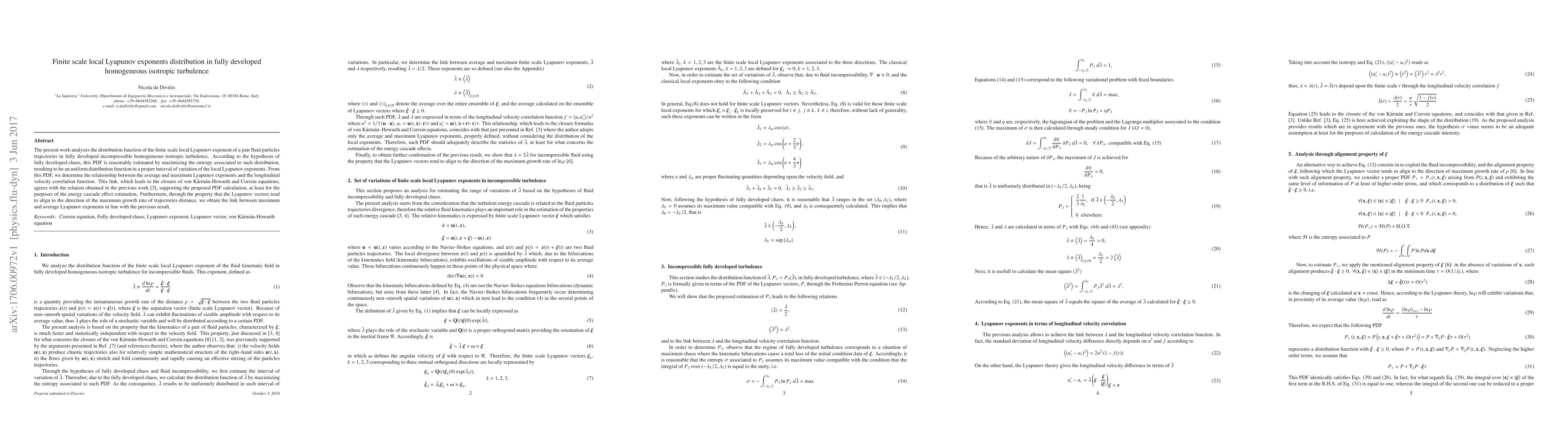 The present work analyzes the distribution function of the finite scale local Lyapunov exponent of a pair fluid particles trajectories in fully developed incompressible homogeneous isotropic turbulence. According to the hypothesis of fully developed chaos, this PDF is reasonably estimated by maximizing the entropy associated to such distribution, resulting to be an uniform distribution function in a proper interval of variation of the local Lyapunov exponents. From this PDF, we determine the relationship between the average and maximum Lyapunov exponents and the longitudinal velocity correlation function. This link, which leads to the closure of von K\`arm\`an--Howarth and Corrsin equations, agrees with the relation obtained in the previous work, supporting the proposed PDF calculation, at least for the purposes of the energy cascade effect estimation. Furthermore, through the property that the Lyapunov vectors tend to align to the direction of the maximum growth rate of trajectories distance, we obtain the link between maximum and average Lyapunov exponents in line with the previous result.