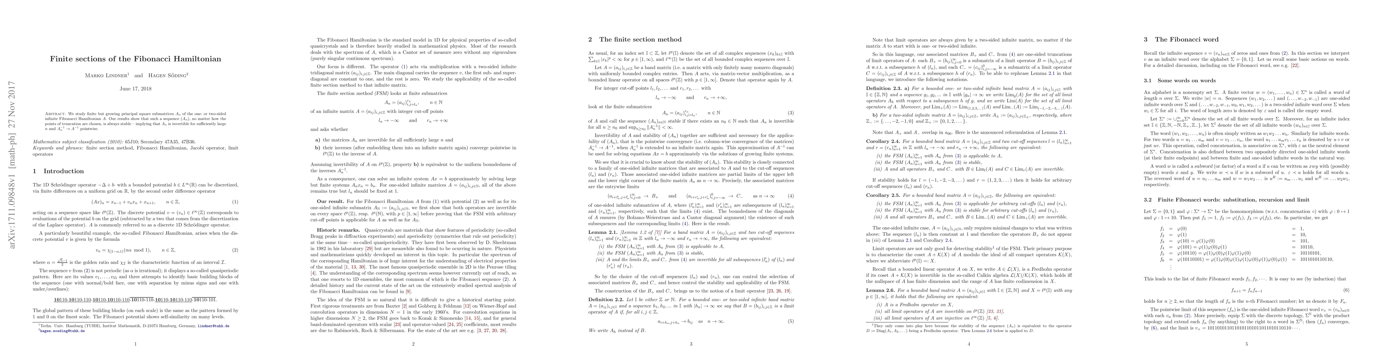 We study finite but growing principal square submatrices $A_n$ of the one- or two-sided infinite Fibonacci Hamiltonian $A$. Our results show that such a sequence $(A_n)$, no matter how the points of truncation are chosen, is always stable -- implying that $A_n$ is invertible for sufficiently large $n$ and $A_n^{-1}\to A^{-1}$ pointwise.
