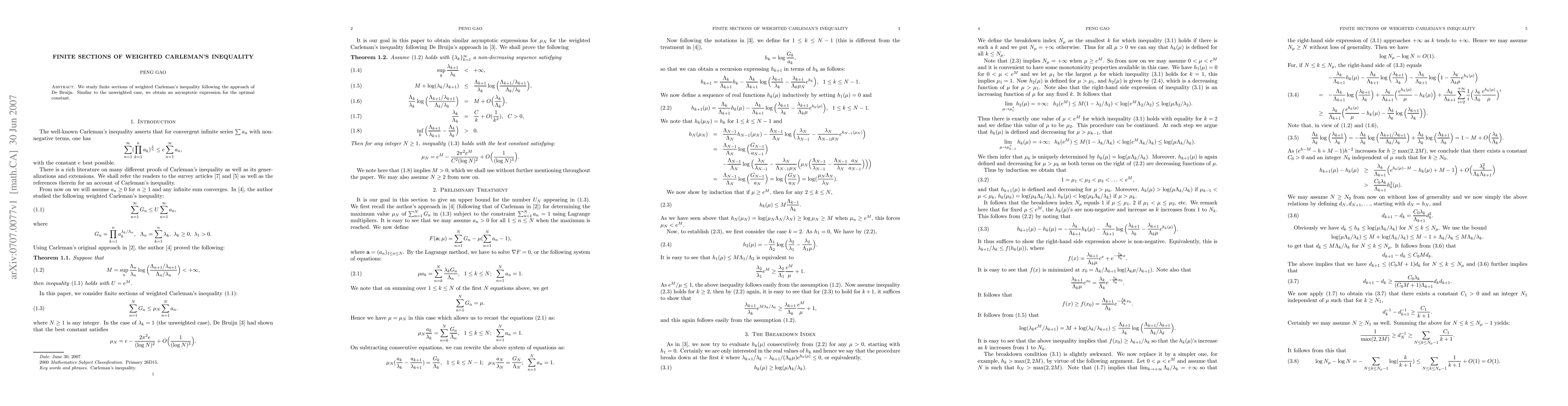 We study finite sections of weighted Carleman's inequality following the approach of De Bruijn. Similar to the unweighted case, we obtain an asymptotic expression for the optimal constant.