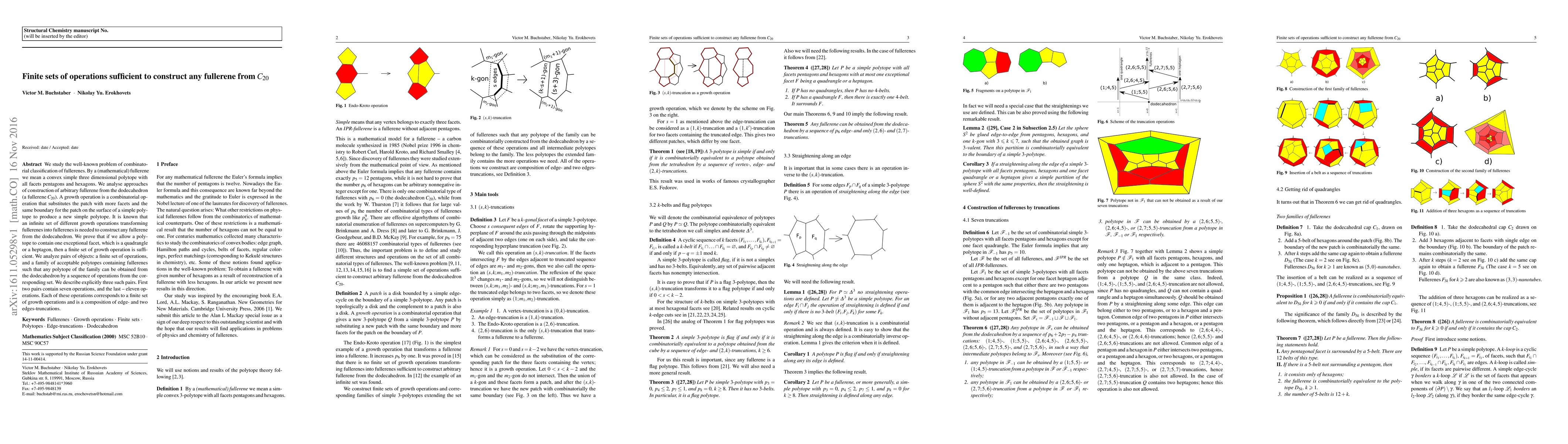 We study the well-known problem of combinatorial classification of fullerenes. By a (mathematical) fullerene we mean a convex simple three dimensional polytope with all facets pentagons and hexagons. We analyse approaches of construction of arbitrary fullerene from the dodecahedron (a fullerene $C_{20}$). A growth operation is a combinatorial operation that substitutes the patch with more facets and the same boundary for the patch on the surface of a simple polytope to produce a new simple polytope. It is known that an infinite set of different growth operations transforming fullerenes into fullerenes is needed to construct any fullerene from the dodecahedron. We prove that if we allow a polytope to contain one exceptional facet, which is a quadrangle or a heptagon, then a finite set of growth operation is sufficient. We analyze pairs of objects: a finite set of operations, and a family of acceptable polytopes containing fullerenes such that any polytope of the family can be obtained from the dodecahedron by a sequence of operations from the corresponding set. We describe explicitly three such pairs. First two pairs contain seven operations, and the last -- eleven operations. Each of these operations corresponds to a finite set of growth operations and is a composition of edge- and two edges-truncations.