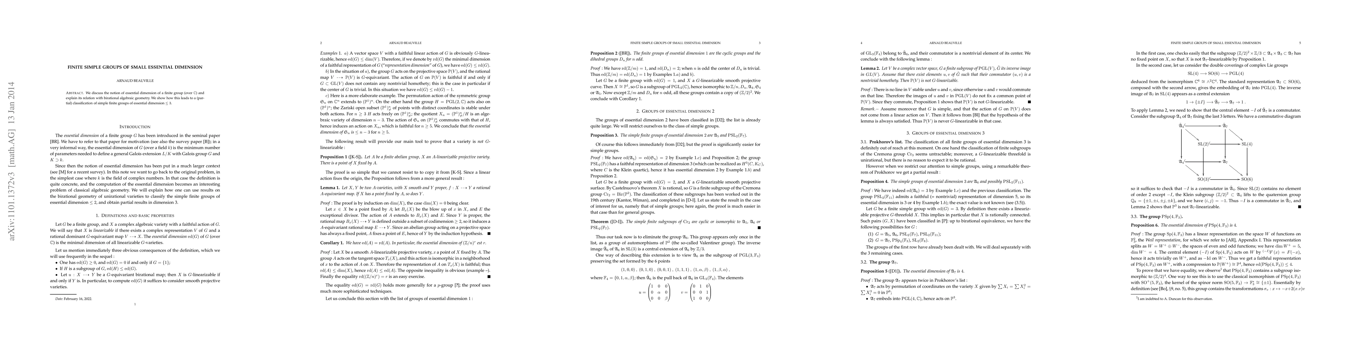 This paper explores the concept of essential dimension in finite groups and its connection to birational algebraic geometry, leading to a partial classification of simple finite groups with an essential dimension of 3 or less.