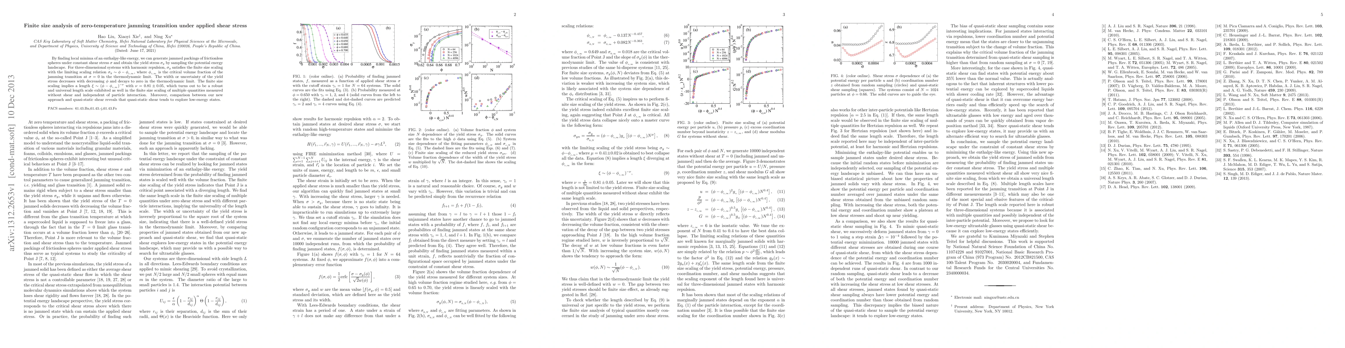 This paper investigates the zero-temperature jamming transition in frictionless spheres under shear stress, revealing a finite size scaling relation for yield stress. The study finds a universal length scale $\xi$ that characterizes the transition, independent of particle interaction details.