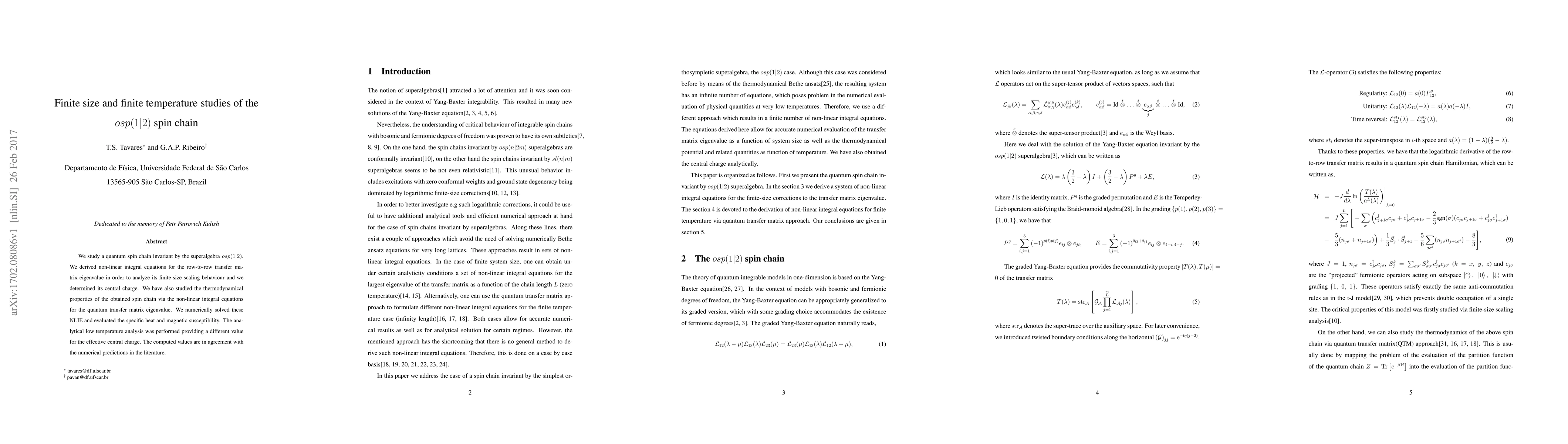 This paper investigates the finite size and temperature behavior of an $osp(1|2)$ invariant quantum spin chain, deriving non-linear integral equations for its transfer matrix eigenvalue. The study includes finite size scaling analysis, determination of the central charge, and numerical evaluation of specific heat and magnetic susceptibility, with analytical low-temperature results corroborating the findings.