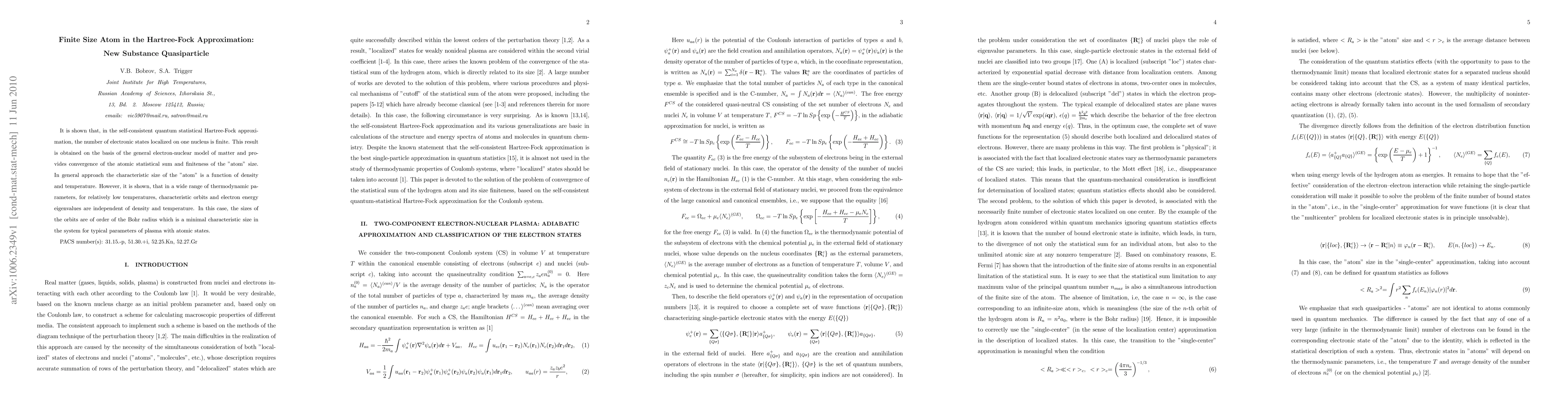 It is shown that, in the self-consistent quantum statistical Hartree-Fock approximation, the number of electronic states localized on one nucleus is finite. This result is obtained on the basis of the general electron-nuclear model of matter and provides convergence of the atomic statistical sum and finiteness of the "atom" size. In general approach the characteristic size of the "atom" is a function of density and temperature. However, it is shown, that in a wide range of thermodynamic parameters, for relatively low temperatures, characteristic orbits and electron energy eigenvalues are independent of density and temperature. In this case, the sizes of the orbits are of order of the Bohr radius which is a minimal characteristic size in the system for typical parameters of plasma with atomic states.