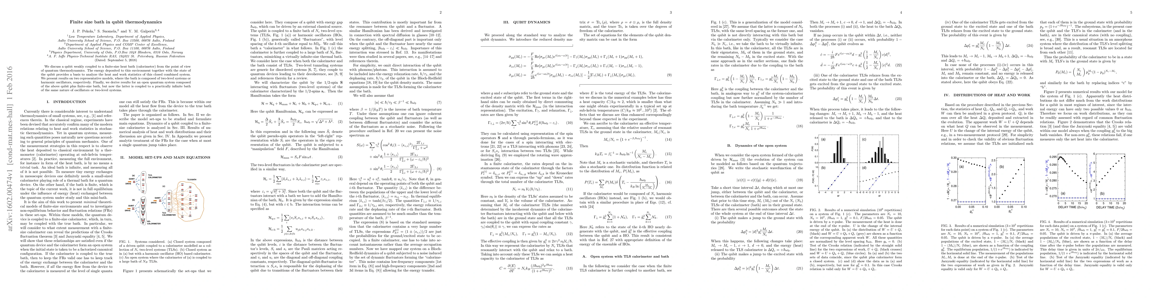 We discuss a qubit weakly coupled to a finite-size heat bath (calorimeter) from the point of view of quantum thermodynamics. The energy deposited to this environment together with the state of the qubit provides a basis to analyze the heat and work statistics of this closed combined system. We present results on two representative models, where the bath is composed of two-level systems or harmonic oscillators, respectively. Finally, we derive results for an open quantum system composed of the above qubit plus finite-size bath, but now the latter is coupled to a practically infinite bath of the same nature of oscillators or two-level systems.