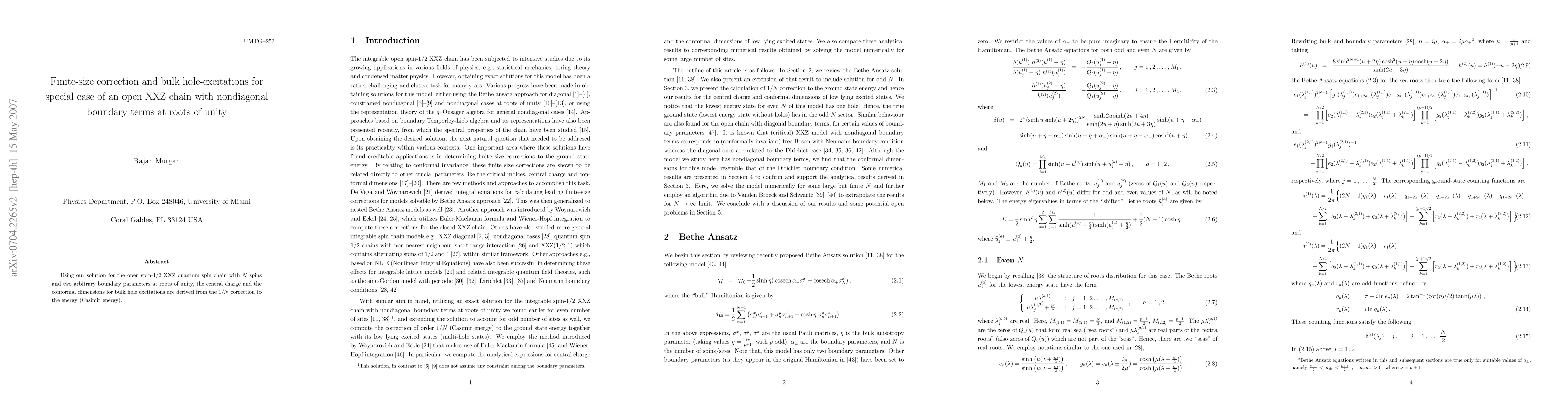 This paper derives the central charge and conformal dimensions for bulk hole excitations in an open spin-1/2 XXZ quantum spin chain with nondiagonal boundary terms at roots of unity, using finite-size correction methods to analyze the Casimir energy. The results are obtained from the 1/N correction to the energy.
