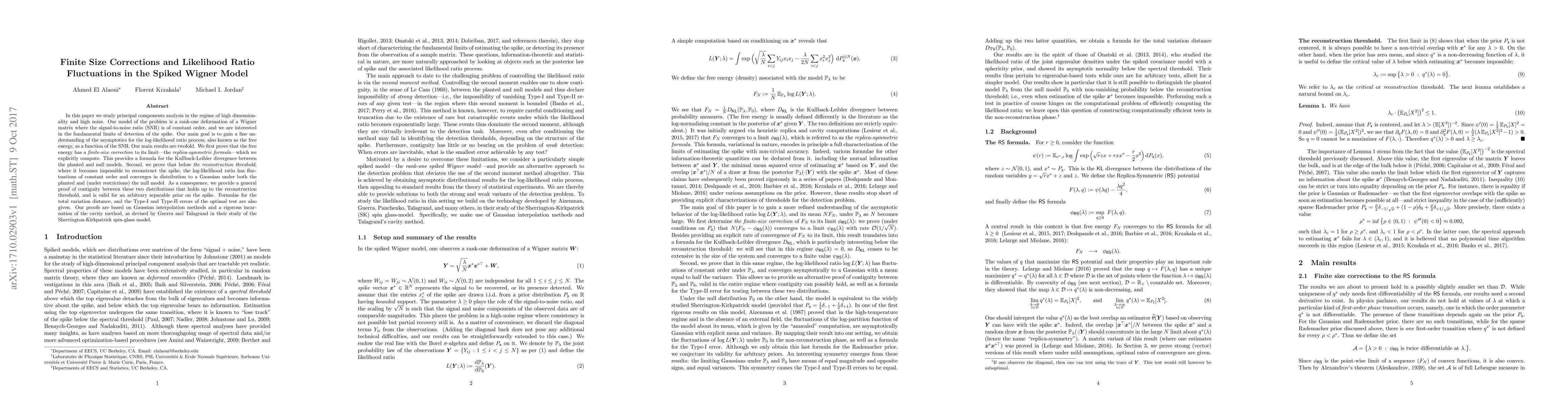 In this paper we study principal components analysis in the regime of high dimensionality and high noise. Our model of the problem is a rank-one deformation of a Wigner matrix where the signal-to-noise ratio (SNR) is of constant order, and we are interested in the fundamental limits of detection of the spike. Our main goal is to gain a fine understanding of the asymptotics for the log-likelihood ratio process, also known as the free energy, as a function of the SNR. Our main results are twofold. We first prove that the free energy has a finite-size correction to its limit---the replica-symmetric formula---which we explicitly compute. This provides a formula for the Kullback-Leibler divergence between the planted and null models. Second, we prove that below the reconstruction threshold, where it becomes impossible to reconstruct the spike, the log-likelihood ratio has fluctuations of constant order and converges in distribution to a Gaussian under both the planted and (under restrictions) the null model. As a consequence, we provide a general proof of contiguity between these two distributions that holds up to the reconstruction threshold, and is valid for an arbitrary separable prior on the spike. Formulae for the total variation distance, and the Type-I and Type-II errors of the optimal test are also given. Our proofs are based on Gaussian interpolation methods and a rigorous incarnation of the cavity method, as devised by Guerra and Talagrand in their study of the Sherrington--Kirkpatrick spin-glass model.
