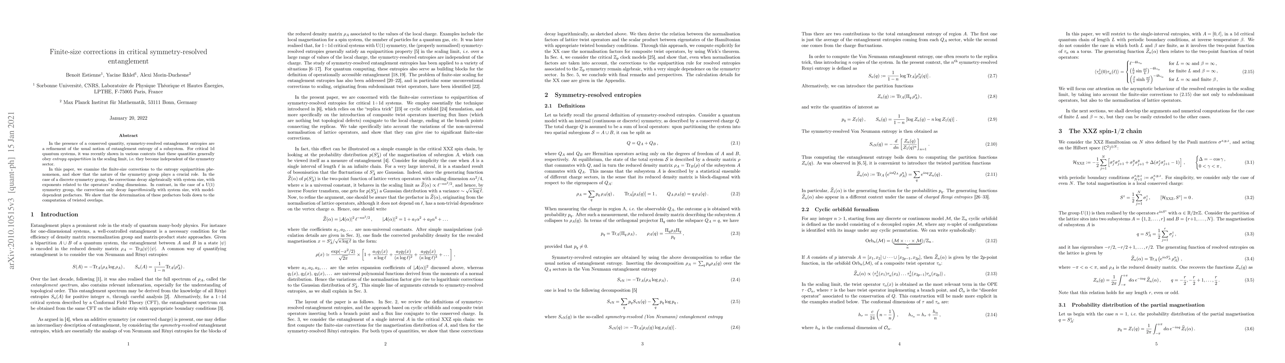 In the presence of a conserved quantity, symmetry-resolved entanglement entropies are a refinement of the usual notion of entanglement entropy of a subsystem. For critical 1d quantum systems, it was recently shown in various contexts that these quantities generally obey entropy equipartition in the scaling limit, i.e. they become independent of the symmetry sector. In this paper, we examine the finite-size corrections to the entropy equipartition phenomenon, and show that the nature of the symmetry group plays a crucial role. In the case of a discrete symmetry group, the corrections decay algebraically with system size, with exponents related to the operators' scaling dimensions. In contrast, in the case of a U(1) symmetry group, the corrections only decay logarithmically with system size, with model-dependent prefactors. We show that the determination of these prefactors boils down to the computation of twisted overlaps.