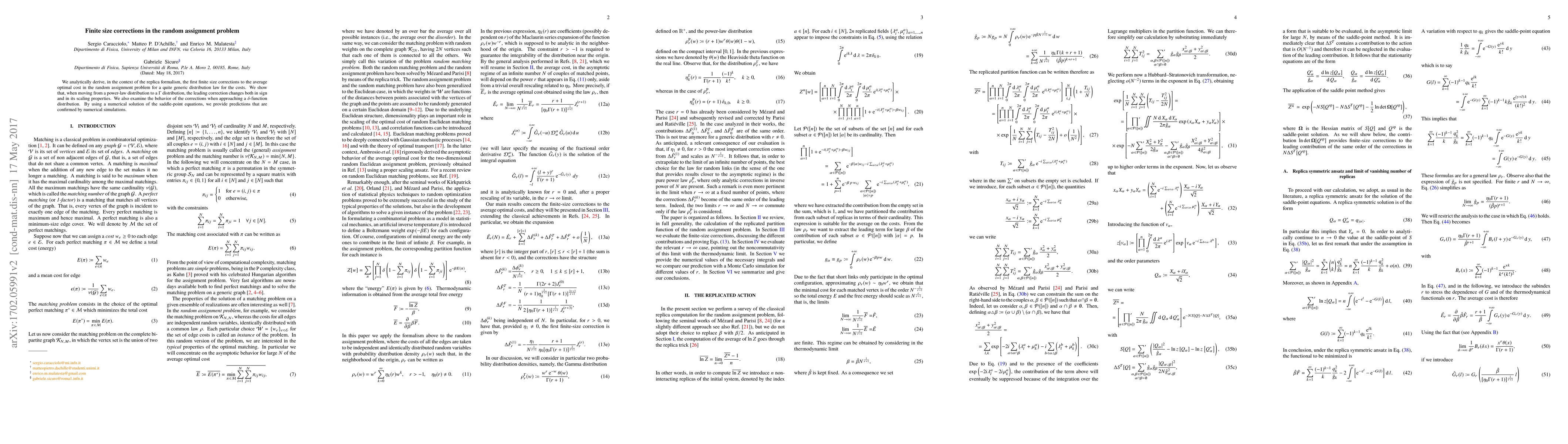 This paper derives the first finite size corrections to the average optimal cost in the random assignment problem using the replica formalism. It reveals that transitioning from a power-law to a $\Gamma$ distribution alters the sign and scaling properties of the leading correction, and examines corrections near a $\delta$-function distribution, validated by numerical simulations.
