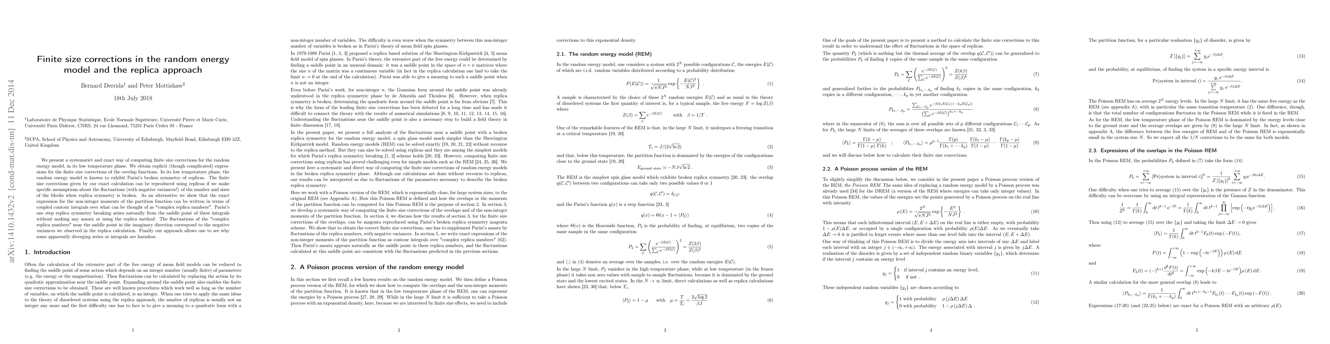 This paper presents an exact method for calculating finite size corrections in the random energy model at low temperatures, revealing Parisi's broken symmetry. It shows that these corrections can be derived using replica theory under specific assumptions about negative variance fluctuations, and it connects these results to complex replica numbers and their saddle point behavior.