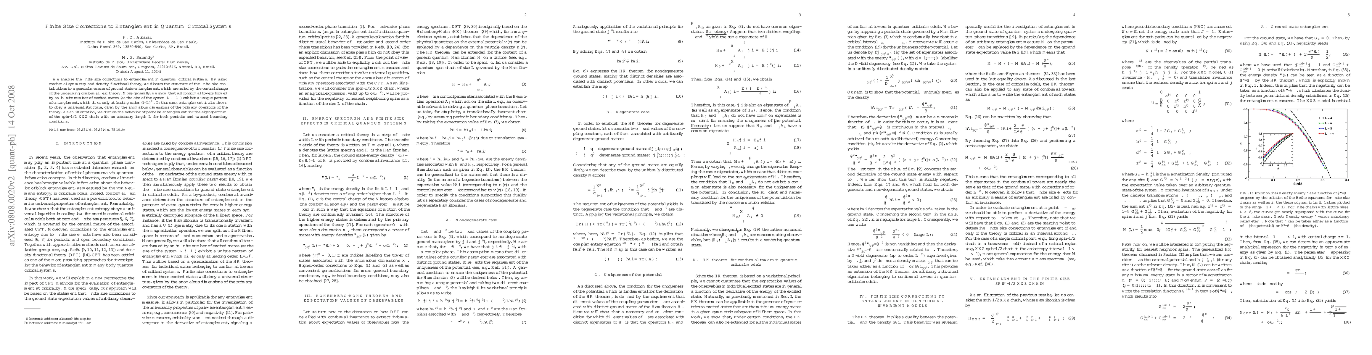 This paper investigates finite size corrections to entanglement in quantum critical systems, employing conformal symmetry and density functional theory. It reveals that despite infinite excited states, entanglement patterns are universal, differing only at leading order $(1/L)^2$, and governed by the central charge and anomalous dimensions of primary operators.