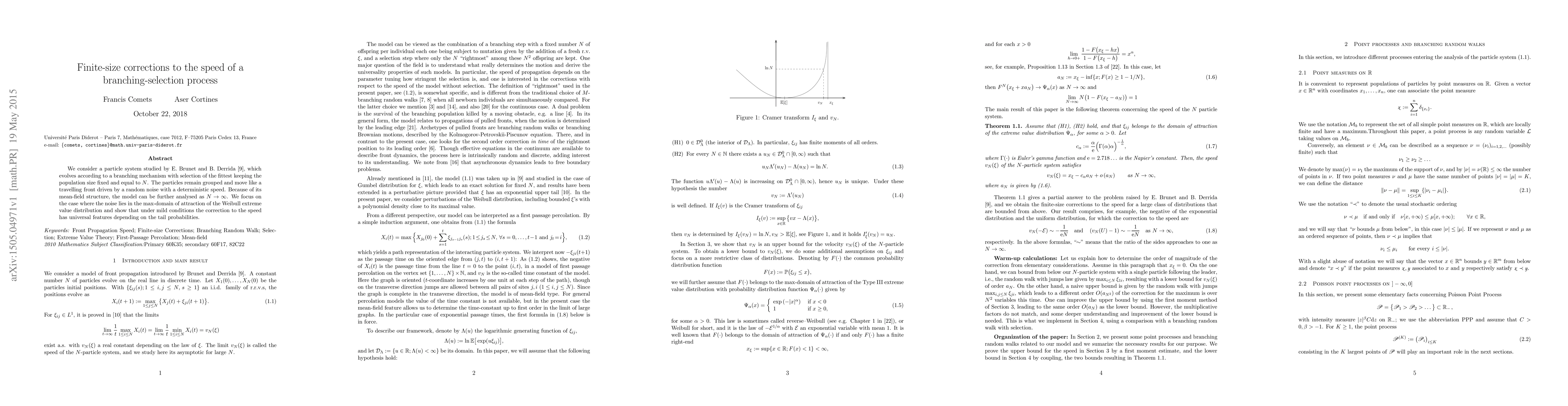 Researchers studied a particle system that evolves according to a branching mechanism with selection of the fittest, finding that finite-size corrections to its speed have universal features depending on tail probabilities.