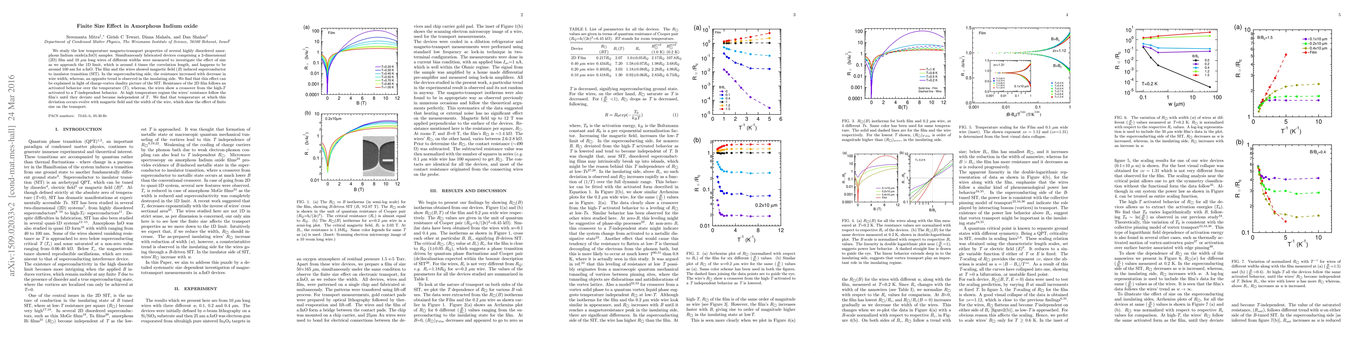 Researchers studied the transport properties of amorphous Indium oxide films and wires with varying widths to investigate how size affects their behavior near a 1D limit. The study found that resistance varies with temperature and magnetic field in a way that can be explained by charge-vortex duality.