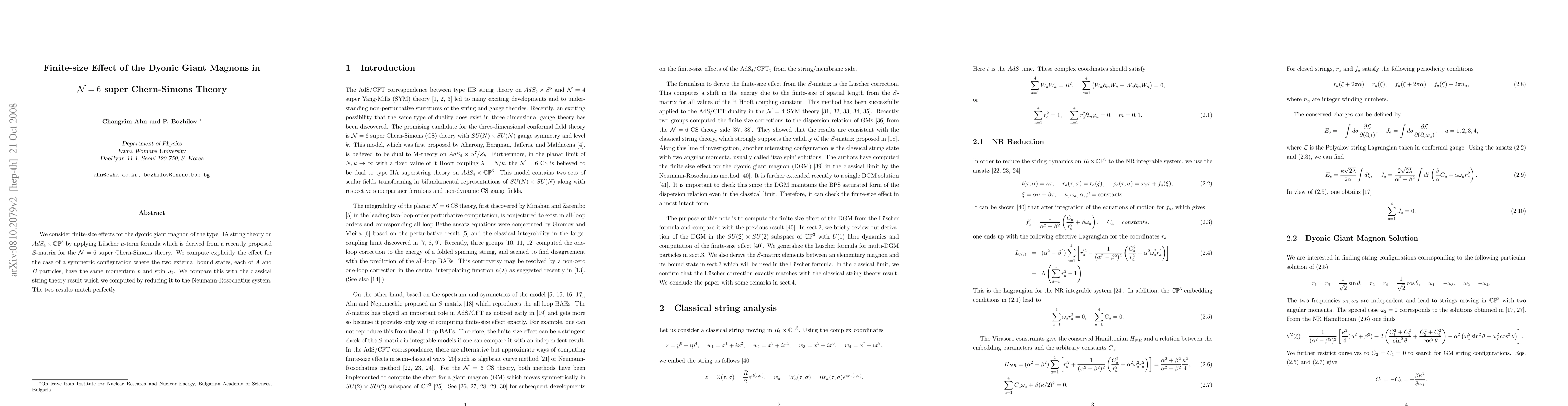 We consider finite-size effects for the dyonic giant magnon of the type IIA string theory on AdS_4 x CP^3 by applying Luscher mu-term formula which is derived from a recently proposed S-matrix for the N=6 super Chern-Simons theory. We compute explicitly the effect for the case of a symmetric configuration where the two external bound states, each of A and B particles, have the same momentum p and spin J_2. We compare this with the classical string theory result which we computed by reducing it to the Neumann-Rosochatius system. The two results match perfectly.