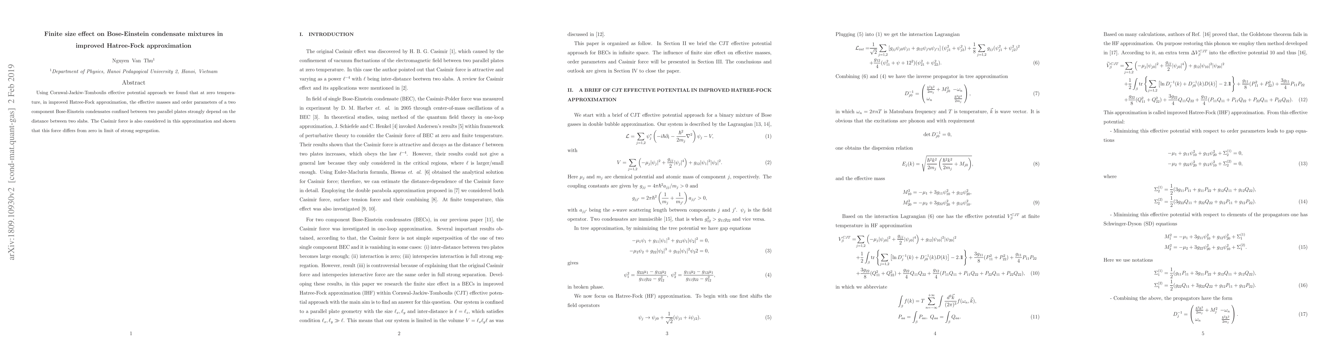 Using Cornwal-Jackiw-Tomboulis effective potential approach we found that at zero temperature, in improved Hartree-Fock approximation, the effective masses and order parameters of a two component Bose-Einstein condensates confined between two parallel plates strongly depend on the distance between two slabs. The Casimir force is also considered in this approximation and shown that this force differs from zero in limit of strong segregation.