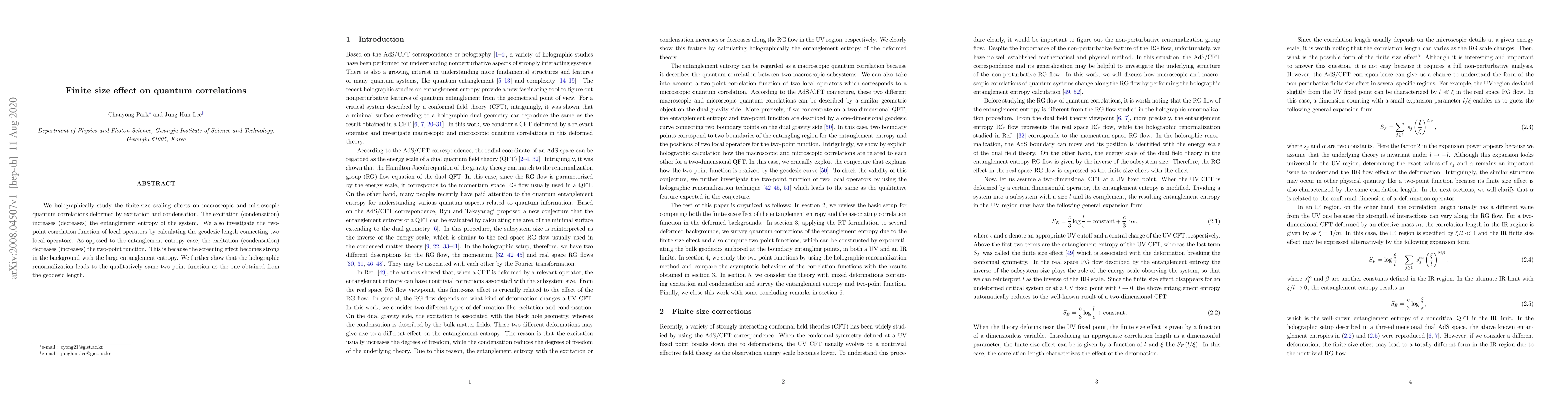 We holographically study the finite-size scaling effects on macroscopic and microscopic quantum correlations deformed by excitation and condensation. The excitation (condensation) increases (decreases) the entanglement entropy of the system. We also investigate the two-point correlation function of local operators by calculating the geodesic length connecting two local operators. As opposed to the entanglement entropy case, the excitation (condensation) decreases (increases) the two-point function. This is because the screening effect becomes strong in the background with the large entanglement entropy. We further show that the holographic renormalization leads to the qualitatively same two-point function as the one obtained from the geodesic length.