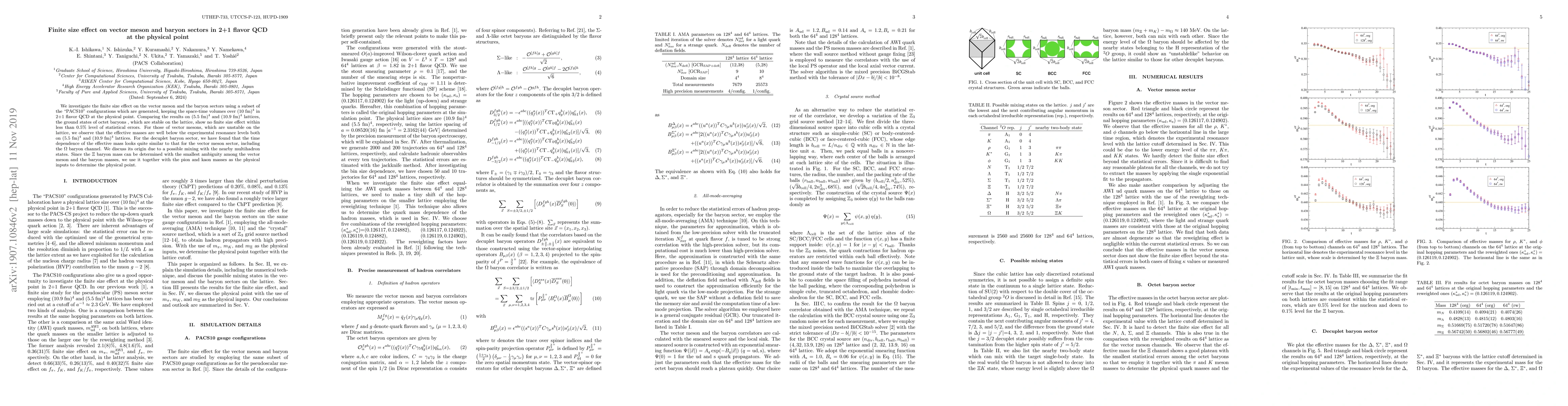 We investigate the finite size effect on the vector meson and the baryon sectors using a subset of the "PACS10" configurations which are generated, keeping the space-time volumes over (10 fm$)^4$ in 2+1 flavor QCD at the physical point. Comparing the results on (5.5 fm$)^4$ and (10.9 fm$)^4$ lattices the ground states of octet baryons , which are stable on the lattice, show no finite size effect within less than 0.5% level of statistical errors. For those of vector mesons, which are unstable on the lattice, we observe that the effective masses are well below the experimental resonance levels both on (5.5 fm$)^4$ and (10.9 fm$)^4$ lattices. For the decuplet baryon sector we have found that the time dependence of the effective mass looks quite similar to that for the vector meson sector including the $\Omega$ baryon channel. We discuss its origin due to a possible mixing with the nearby multihadron states. Since the $\Xi$ baryon mass can be determined with the smallest ambiguity among the vector meson and the baryon masses, we use it together with the pion and kaon masses as the physical inputs to determine the physical point.