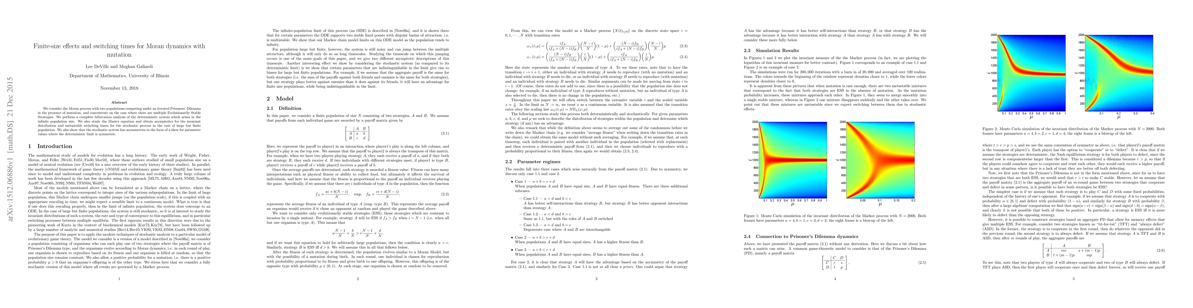 This paper studies the Moran process with mutation in multiple Evolutionarily Stable Strategies, analyzing finite-size effects and switching times for a stochastic system. It finds asymmetries in the parameter values where the deterministic limit is symmetric.