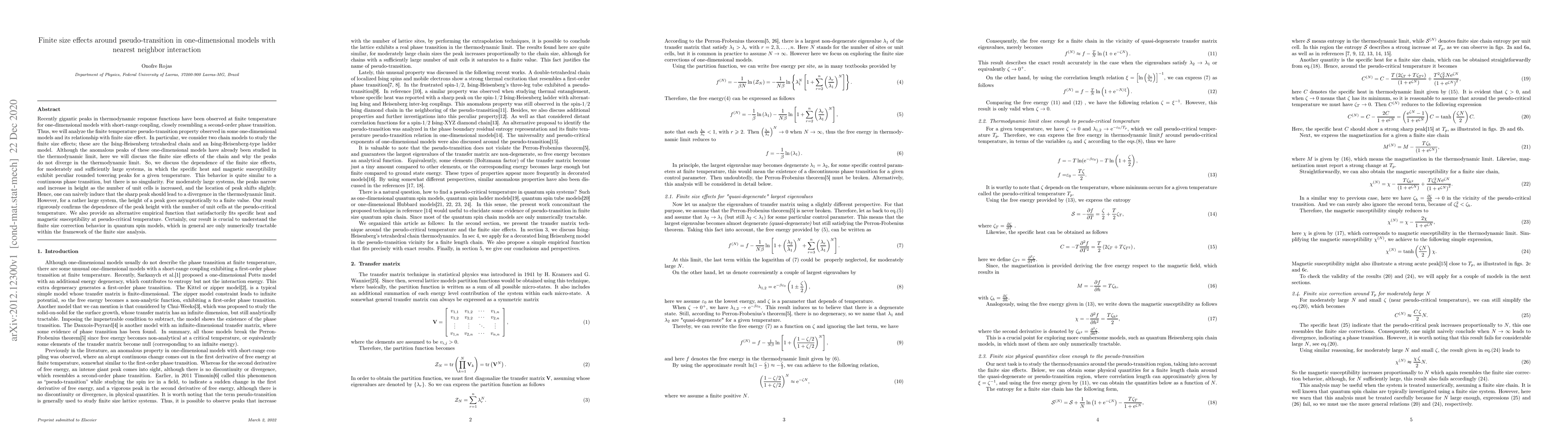 Researchers study the pseudo-transition in one-dimensional models with nearest neighbor interaction, finding that finite size effects lead to rounded peaks similar to continuous phase transitions, but with no divergence in the thermodynamic limit.