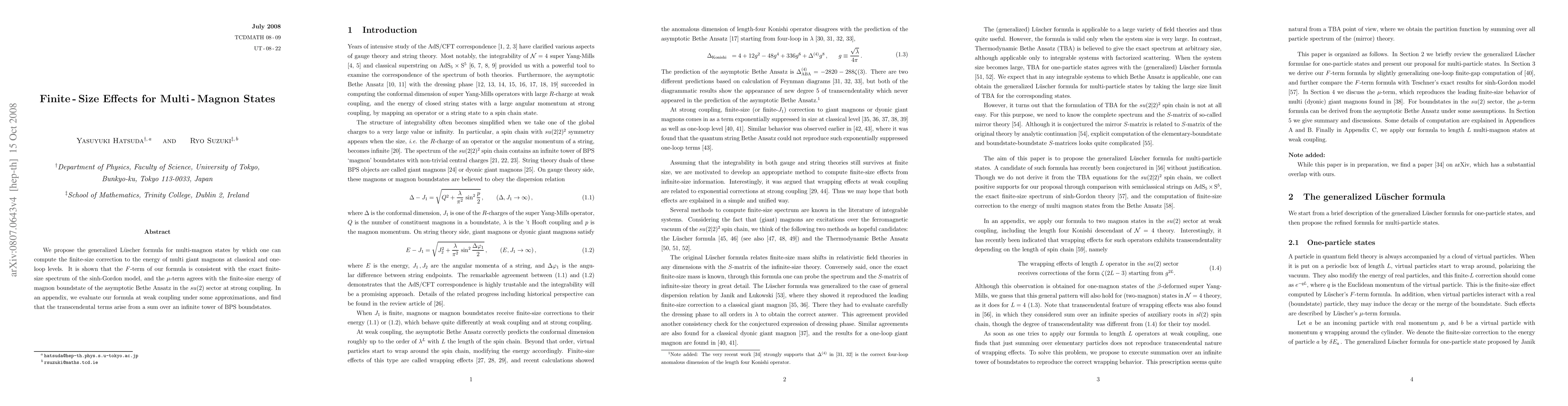 This research introduces a generalized Luscher formula to calculate finite-size corrections in multi-magnon states' energy at classical and one-loop levels. It confirms consistency with sinh-Gordon model's exact spectrum and strong coupling magnon boundstate energies. The paper also explores weak coupling approximations, revealing transcendental terms from an infinite tower of BPS boundstates.