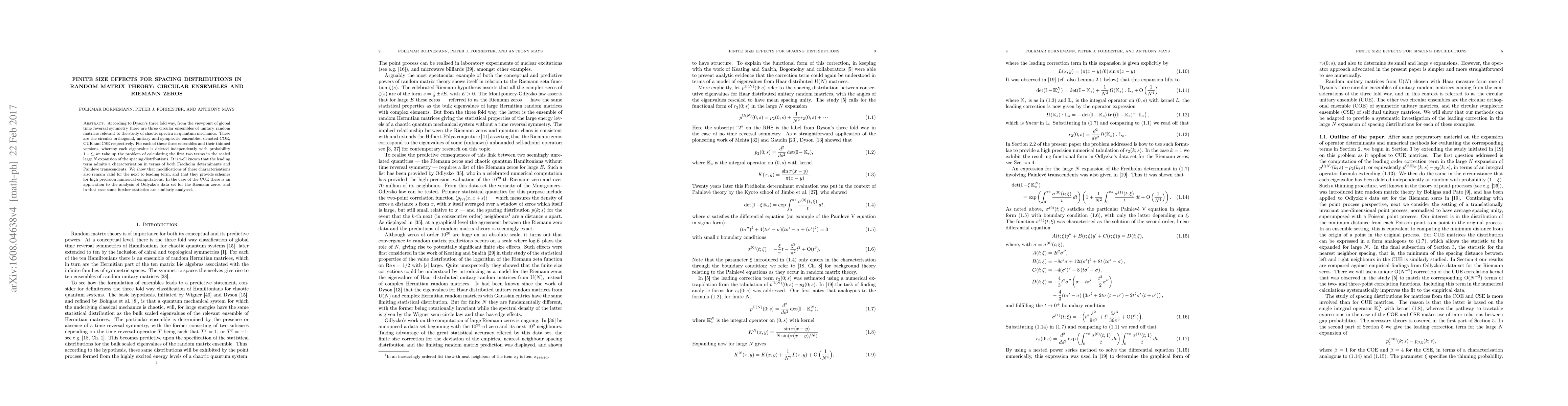 This paper explores finite size effects on spacing distributions in random matrix theory's circular ensembles (COE, CUE, CSE). It demonstrates that characterizations of the leading term in large N expansion, involving Fredholm determinants and Painlevé transcendents, also apply to the next-to-leading term. This allows for precise numerical computations. The findings are applied to Odlyzko's data set concerning Riemann zeros, specifically in the CUE case, enabling further statistical analysis.