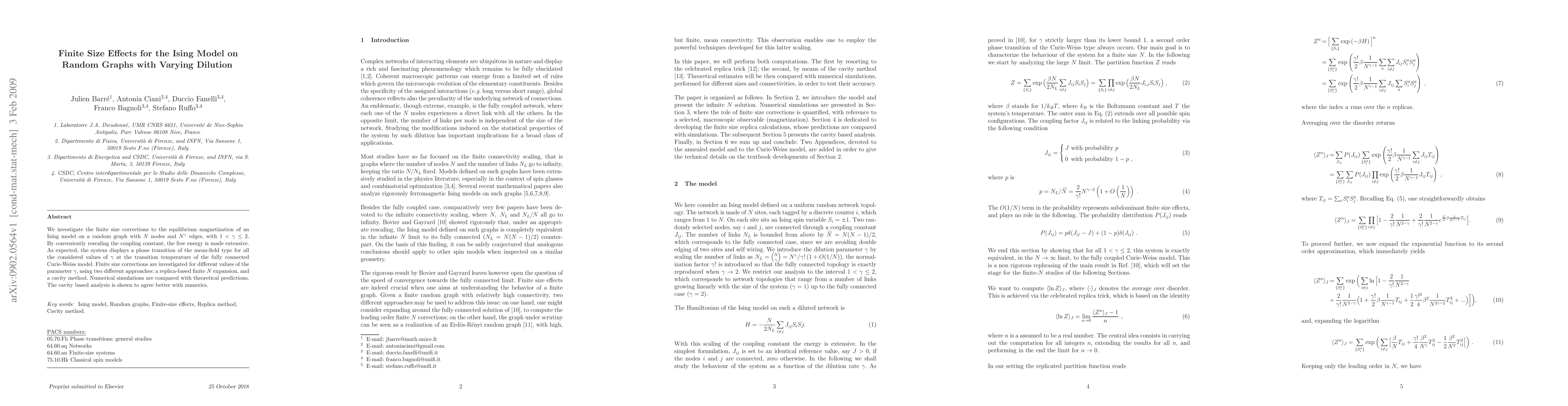 We investigate the finite size corrections to the equilibrium magnetization of an Ising model on a random graph with $N$ nodes and $N^{\gamma}$ edges, with $1 < \gamma \leq 2$. By conveniently rescaling the coupling constant, the free energy is made extensive. As expected, the system displays a phase transition of the mean-field type for all the considered values of $\gamma$ at the transition temperature of the fully connected Curie-Weiss model. Finite size corrections are investigated for different values of the parameter $\gamma$, using two different approaches: a replica-based finite $N$ expansion, and a cavity method. Numerical simulations are compared with theoretical predictions. The cavity based analysis is shown to agree better with numerics.