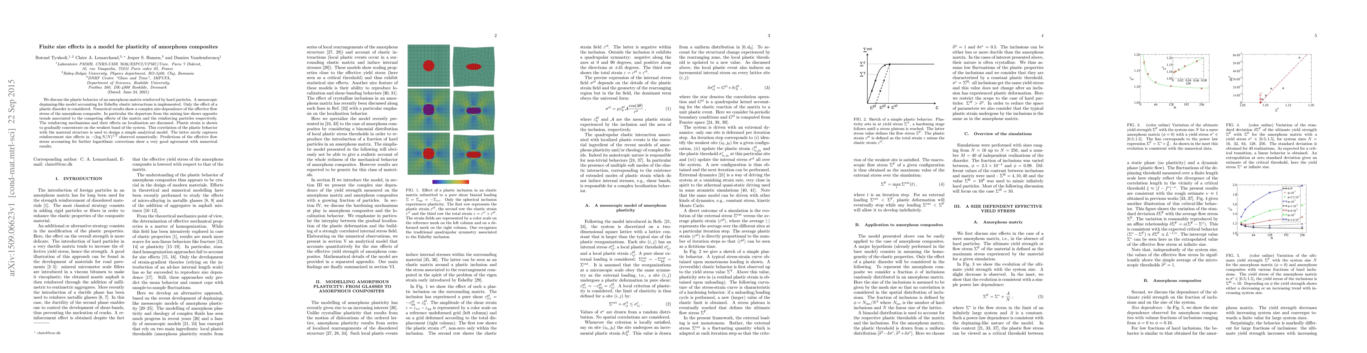 We discuss the plastic behavior of an amorphous matrix reinforced by hard particles. A mesoscopic depinning-like model accounting for Eshelby elastic interactions is implemented. Only the effect of a plastic disorder is considered. Numerical results show a complex size-dependence of the effective flow stress of the amorphous composite. In particular the departure from the mixing law shows opposite trends associated to the competing effects of the matrix and the reinforcing particles respectively. The reinforcing mechanisms and their effects on localization are discussed. Plastic strain is shown to gradually concentrate on the weakest band of the system. This correlation of the plastic behavior with the material structure is used to design a simple analytical model. The latter nicely captures reinforcement size effects in $-(\log N/N)^{1/2}$ observed numerically. Predictions of the effective flow stress accounting for further logarithmic corrections show a very good agreement with numerical results.