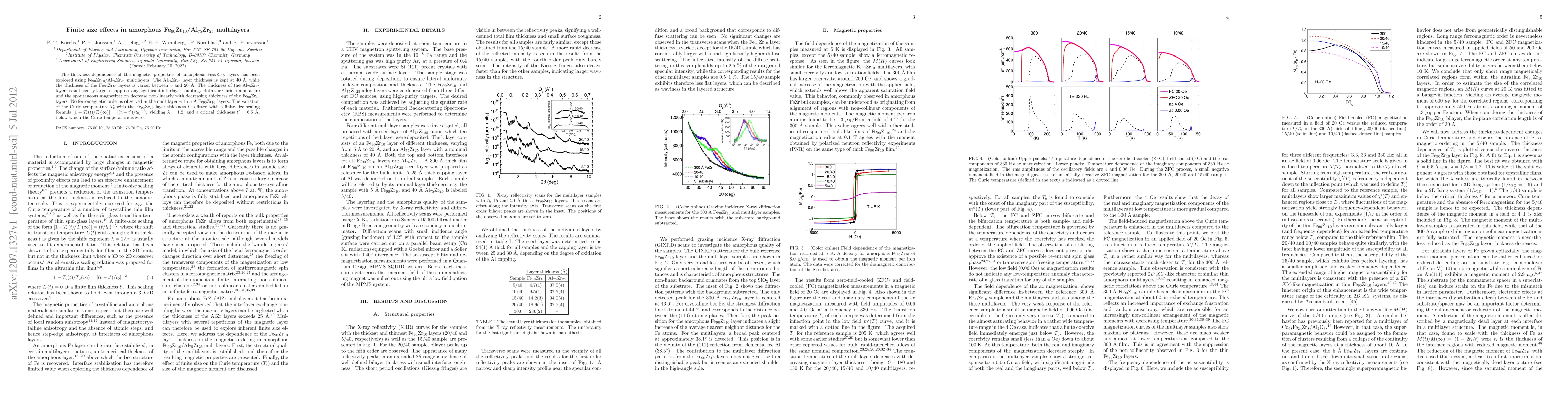 The thickness dependence of the magnetic properties of amorphous Fe90Zr10 layers has been explored using Fe90Zr10/Al75Zr25 multilayers. The Al75Zr25 layer thickness is kept at 40 \AA, while the thickness of the Fe90Zr10 layers is varied between 5 and 20 \AA. The thickness of the Al75Zr25 layers is sufficiently large to suppress any significant interlayer coupling. Both the Curie temperature and the spontaneous magnetization decrease non-linearly with decreasing thickness of the Fe90Zr10 layers. No ferromagnetic order is observed in the multilayer with 5 {\AA} Fe90Zr10 layers. The variation of the Curie temperature $T_c$ with the Fe90Zr10 layer thickness $t$ is fitted with a finite-size scaling formula $[1-\Tc(t)/\Tc(\infty)]=[(t-t')/t_0]^{-\lambda}$, yielding $\lambda=1.2$, and a critical thickness $t'=6.5$ \AA, below which the Curie temperature is zero.