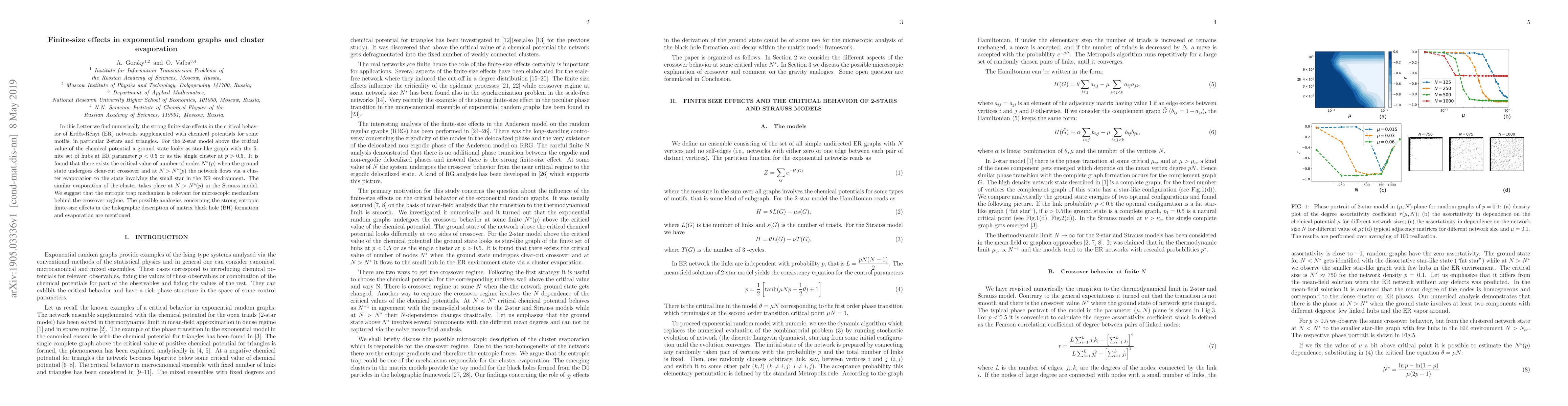 In this Letter we find numerically the strong finite-size effects in the critical behavior of Erd\H{o}s-R\'enyi (ER) networks supplemented with chemical potentials for some motifs, in particular 2-stars and triangles. For the 2-star model above the critical value of the chemical potential a ground state looks as star-like graph with the finite set of hubs at ER parameter $p<0.5$ or as the single cluster at $p>0.5$. It is found that there exists the critical value of number of nodes $N^{*}(p)$ when the ground state undergoes clear-cut crossover and at $N>N^{*}(p)$ the network flows via a cluster evaporation to the state involving the small star in the ER environment. The similar evaporation of the cluster takes place at $N>N^{*}(p)$ in the Strauss model. We suggest that the entropic trap mechanism is relevant for microscopic mechanism behind the crossover regime. The possible analogies concerning the strong entropic finite-size effects in the holographic description of matrix black hole (BH) formation and evaporation are mentioned.
