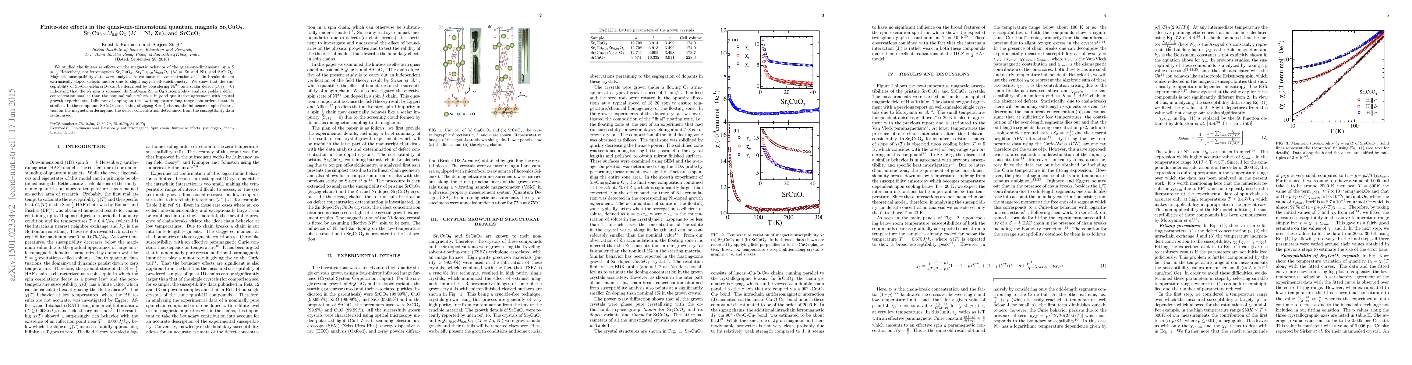 This paper investigates finite-size effects on quasi-one-dimensional quantum magnets in Sr$_{2}$CuO$_{3}$, Sr$_{2}$Cu$_{0.99}$M$_{0.01}$O$_{3}$ (M = Zn and Ni), and SrCuO$_{2}$. Magnetic susceptibility data reveal the concentration of chain-breaks due to extrinsic doping and oxygen off-stoichiometry, showing that Ni$^{2+}$ in Sr$_{2}$Cu$_{0.99}$Ni$_{0.01}$O$_{3}$ is screened, while Zn$^{2+}$ in Sr$_{2}$Cu$_{0.99}$Zn$_{0.01}$O$_{3}$ has a lower defect concentration than expected.