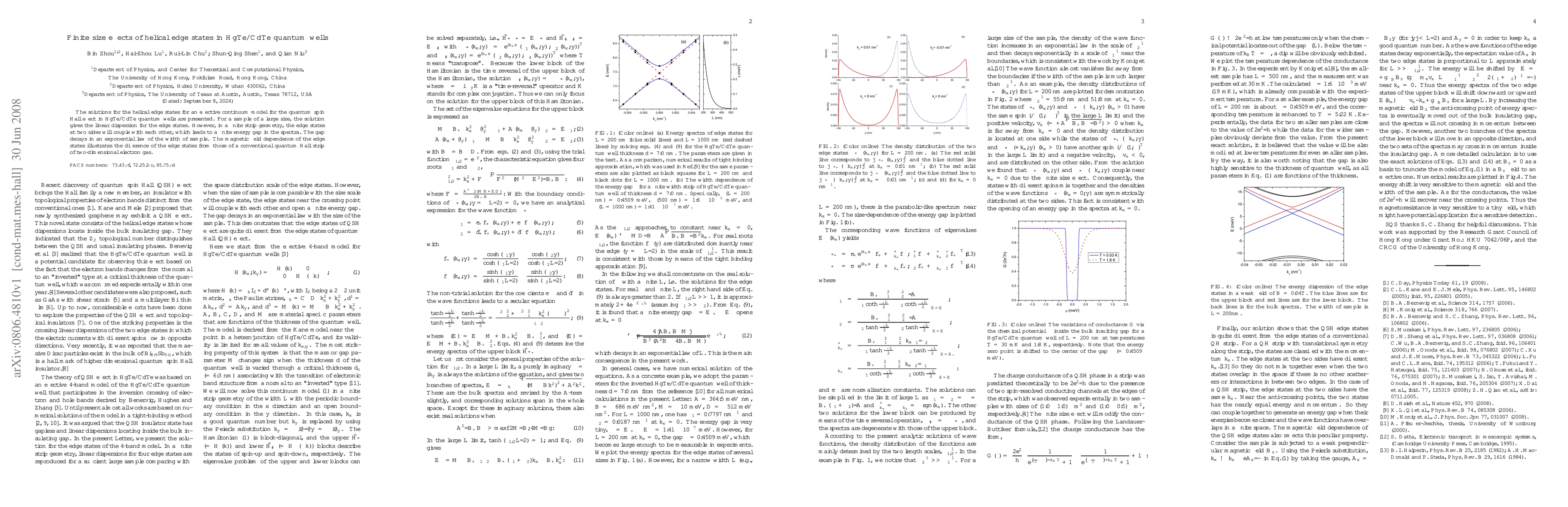 This paper investigates helical edge states in HgTe/CdTe quantum wells, showing that large samples exhibit linear dispersion while finite strips develop a finite energy gap due to coupling between edge states, which decays exponentially with width. Magnetic field dependence differs from conventional quantum Hall effects.