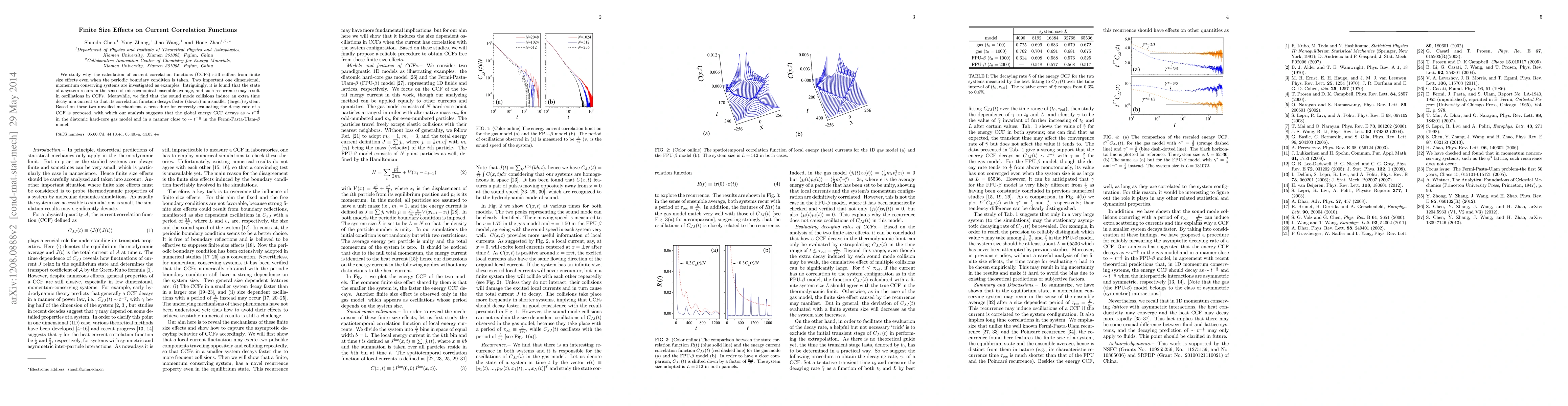 We study why the calculation of current correlation functions (CCFs) still suffers from finite size effects even when the periodic boundary condition is taken. Two important one dimensional, momentum conserving systems are investigated as examples. Intriguingly, it is found that the state of a system recurs in the sense of microcanonical ensemble average, and such recurrence may result in oscillations in CCFs. Meanwhile, we find that the sound mode collisions induce an extra time decay in a current so that its correlation function decays faster (slower) in a smaller (larger) system. Based on these two unveiled mechanisms, a procedure for correctly evaluating the decay rate of a CCF is proposed, with which our analysis suggests that the global energy CCF decays as $\sim t^{-\frac{2}{3}}$ in the diatomic hard-core gas model and in a manner close to $\sim t^{-\frac{1}{2}}$ in the Fermi-Pasta-Ulam-$\beta$ model.