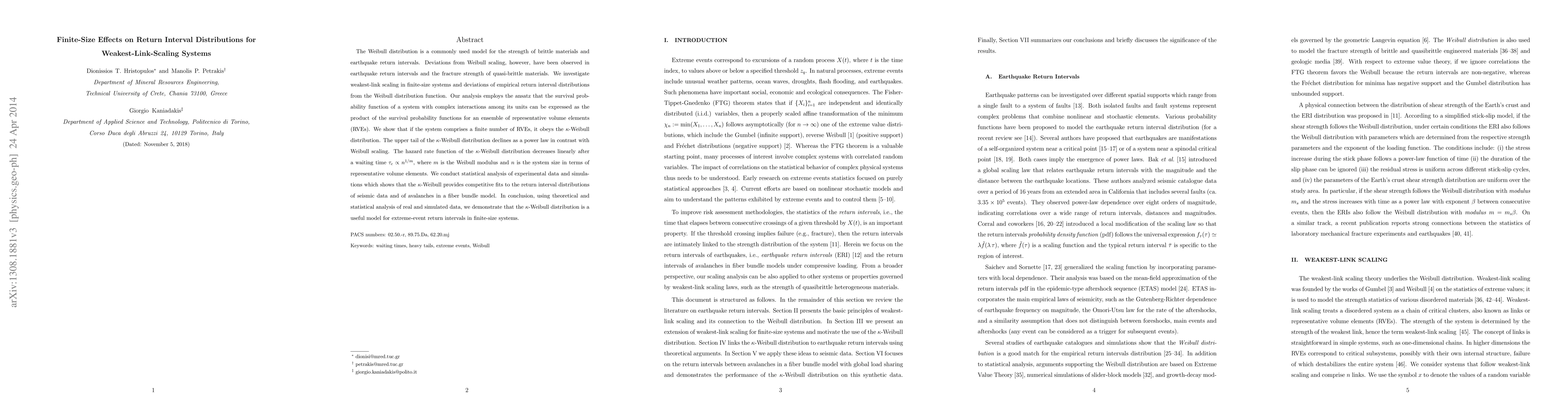 The Weibull distribution is a commonly used model for the strength of brittle materials and earthquake return intervals. Deviations from Weibull scaling, however, have been observed in earthquake return intervals and in the fracture strength of quasi-brittle materials. We investigate weakest-link scaling in finite-size systems and deviations of empirical return interval distributions from the Weibull distribution function. We use the ansatz that the survival probability function of a system with complex interactions among its units can be expressed as the product of the survival probability functions for an ensemble of representative volume elements (RVEs). We show that if the system comprises a finite number of RVEs, it obeys the $\kappa$-Weibull distribution. We conduct statistical analysis of experimental data and simulations that show good agreement with the $\kappa$-Weibull distribution. We show the following: (1) The weakest-link theory for finite-size systems involves the $\kappa$-Weibull distribution. (2) The power-law decline of the $\kappa$-Weibull upper tail can explain deviations from the Weibull scaling observed in return interval data. (3) The hazard rate function of the $\kappa$-Weibull distribution decreases linearly after a waiting time $\tau_c \propto n^{1/m}$, where $m$ is the Weibull modulus and $n$ is the system size in terms of representative volume elements. (4) The $\kappa$-Weibull provides competitive fits to the return interval distributions of seismic data and of avalanches in a fiber bundle model. In conclusion, using theoretical and statistical analysis of real and simulated data, we show that the $\kappa$-Weibull distribution is a useful model for extreme-event return intervals in finite-size systems.