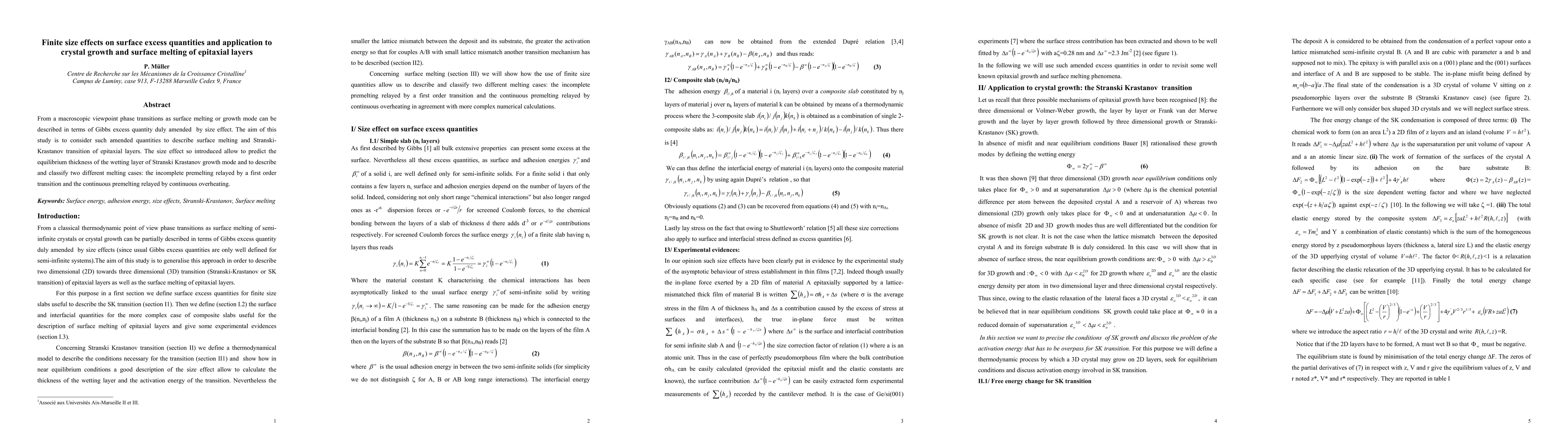 From a macroscopic point of view phase transitions as surface melting or two dimensional (2D) towards three dimensional (3D) growth mode (Stranski-Krastanov transition) can be described in terms of Gibbs excess quantity duly amended by size effects (since usual Gibbs excess quantities are only well defined for semi-infinite systems). The aim of this study is to consider such amended quantities to describe surface melting and Stranski-Krastanov transition of epitaxial layers. the so-introduced size effects allows us to predict the equilibrium thickness of the wetting layer of the Stranski-Krastanov growth mode and to describe and classify two different melting cases: the incomplete melting relayed by a first order transition and the continuous premelting relayed by continuous overheating