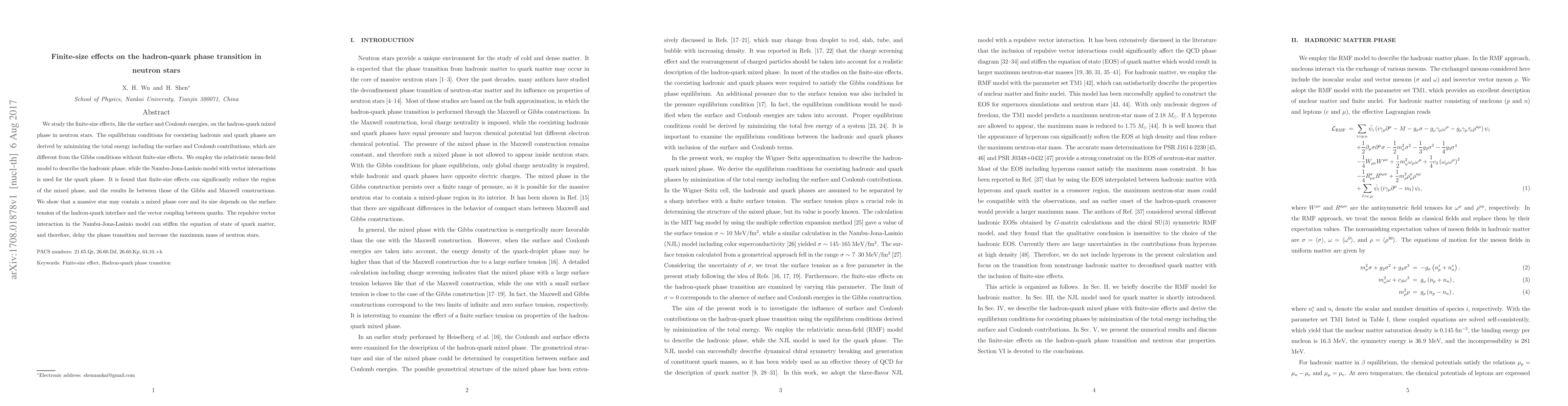 This paper investigates how finite-size effects, such as surface and Coulomb energies, influence the hadron-quark phase transition in neutron stars, finding that these effects significantly reduce the mixed-phase region and alter the equilibrium conditions compared to traditional Gibbs conditions. The study uses relativistic and Nambu-Jona-Lasinio models to describe the hadronic and quark phases, respectively.