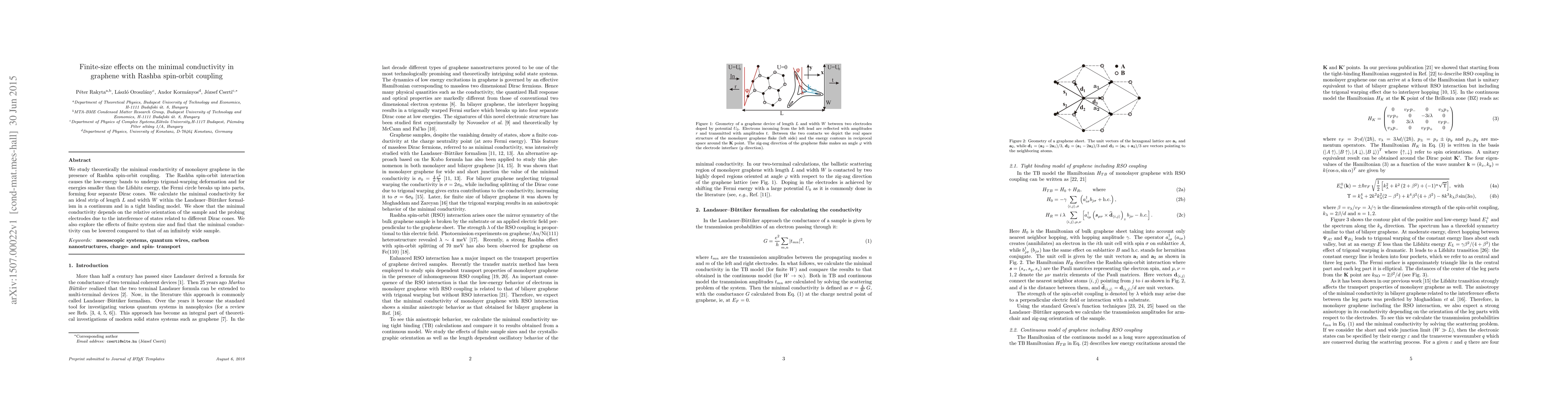 This paper investigates the minimal conductivity of graphene with Rashba spin-orbit coupling, showing how finite-size effects and the orientation of electrodes influence conductivity. It finds that the minimal conductivity can be reduced in finite-width samples due to interference between states from different Dirac cones.
