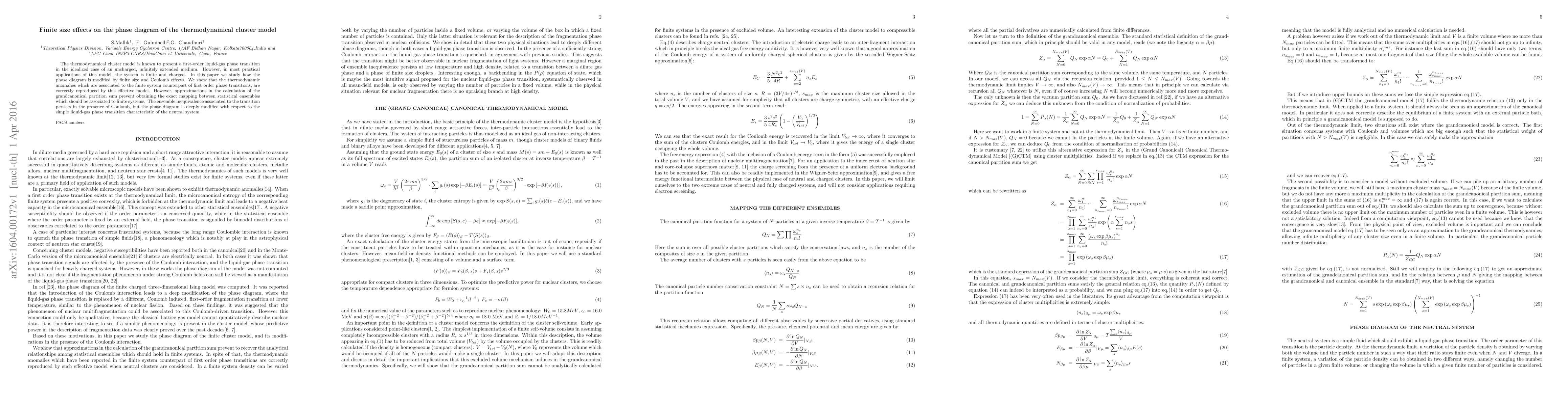 This paper investigates the impact of finite size and Coulomb effects on the phase diagram of the thermodynamical cluster model, revealing that while finite size reproduces thermodynamic anomalies, approximations in the grandcanonical partition sum calculation prevent exact mapping between statistical ensembles, and the phase diagram is significantly altered compared to the neutral liquid-gas transition.
