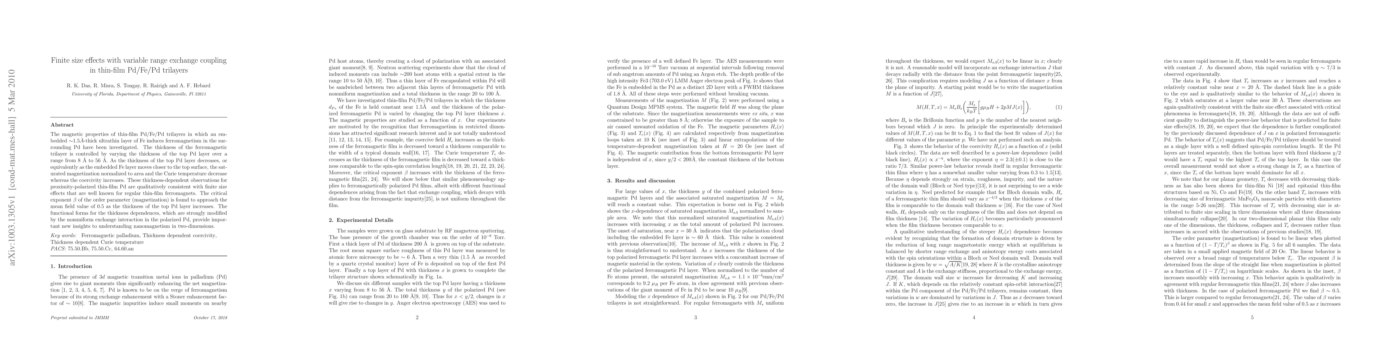 The magnetic properties of thin-film Pd/Fe/Pd trilayers in which an embedded ~1.5 A-thick ultrathin layer of Fe induces ferromagnetism in the surrounding Pd have been investigated. The thickness of the ferromagnetic trilayer is controlled by varying the thickness of the top Pd layer over a range from 8 A to 56 A. As the thickness of the top Pd layer decreases, or equivalently as the embedded Fe layer moves closer to the top surface, the saturated magnetization normalized to area and the Curie temperature decrease whereas the coercivity increases. These thickness-dependent observations for proximity-polarized thin-film Pd are qualitatively consistent with finite size effects that are well known for regular thin-film ferromagnets. The critical exponent $\beta$ of the order parameter (magnetization) is found to approach the mean field value of 0.5 as the thickness of the top Pd layer increases. The functional forms for the thickness dependences, which are strongly modified by the nonuniform exchange interaction in the polarized Pd, provide important new insights to understanding nanomagnetism in two-dimensions.