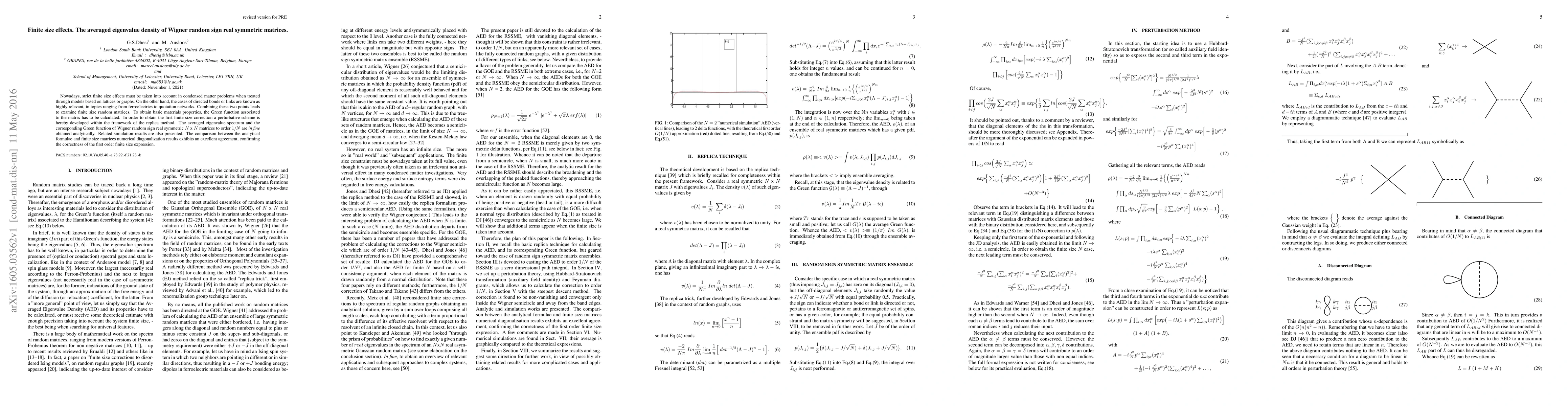 Nowadays, strict finite size effects must be taken into account in condensed matter problems when treated through models based on lattices or graphs. On the other hand, the cases of directed bonds or links are known as highly relevant, in topics ranging from ferroelectrics to quotation networks. Combining these two points leads to examine finite size random matrices. To obtain basic materials properties, the Green function associated to the matrix has to be calculated. In order to obtain the first finite size correction a perturbative scheme is hereby developed within the framework of the replica method. The averaged eigenvalue spectrum and the corresponding Green function of Wigner random sign real symmetric N x N matrices to order 1/N are in fine obtained analytically. Related simulation results are also presented. The comparison between the analytical formulae and finite size matrices numerical diagonalization results exhibits an excellent agreement, confirming the correctness of the first order finite size expression.