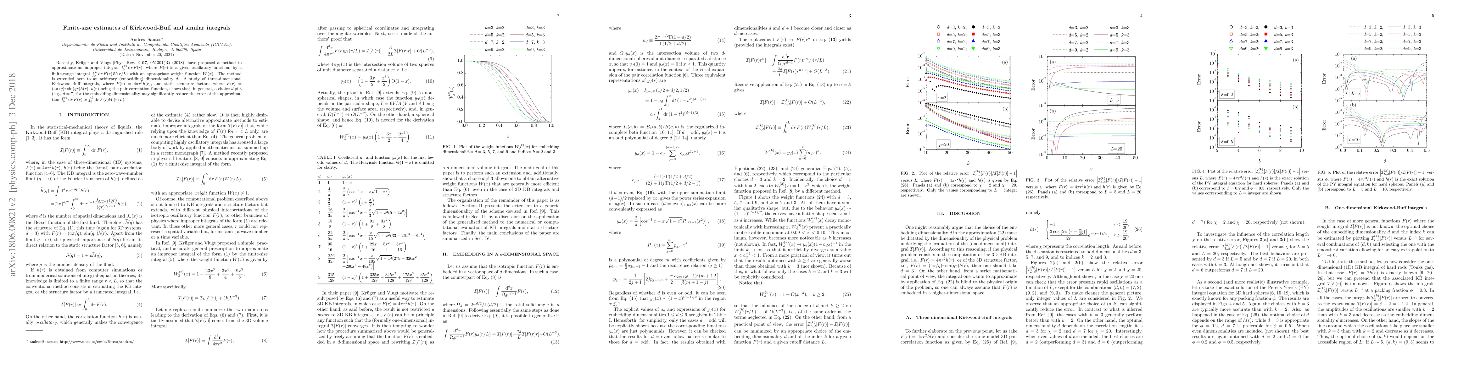 Recently, Kr\"uger and Vlugt [Phys. Rev. E 97, 051301(R) (2018)] have proposed a method to approximate an improper integral $\int_0^\infty \text{d}r\, F(r)$, where $F(r)$ is a given oscillatory function, by a finite-range integral $\int_0^L \text{d}r\, F(r) W(r/L)$ with an appropriate weight function $W(x)$. The method is extended here to an arbitrary (embedding) dimensionality $d$. A study of three-dimensional Kirkwood-Buff integrals, where $F(r)=4\pi r^2h(r)$, and static structure factors, where $F(r)=(4\pi/q) r\sin(qr) h(r)$, $h(r)$ being the pair correlation function, shows that, in general, a choice $d\neq 3$ (e.g., $d=7$) for the embedding dimensionality may significantly reduce the error of the approximation $\int_0^\infty \text{d}r\, F(r)\simeq \int_0^L \text{d}r\, F(r) W(r/L)$.