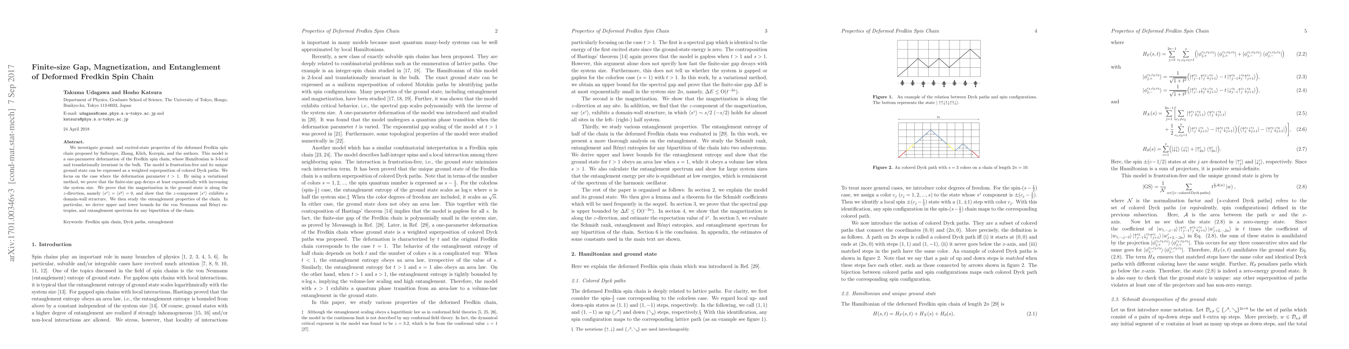 We investigate ground- and excited-state properties of the deformed Fredkin spin chain proposed by Salberger, Zhang, Klich, Korepin, and the authors. This model is a one-parameter deformation of the Fredkin spin chain, whose Hamiltonian is $3$-local and translationally invariant in the bulk. The model is frustration-free and its unique ground state can be expressed as a weighted superposition of colored Dyck paths. We focus on the case where the deformation parameter $t>1$. By using a variational method, we prove that the finite-size gap decays at least exponentially with increasing the system size. We prove that the magnetization in the ground state is along the $z$-direction, namely $\langle s^x \rangle =\langle s^y \rangle=0$, and show that the $z$-component $\langle s^z \rangle$ exhibits a domain-wall structure. We then study the entanglement properties of the chain. In particular, we derive upper and lower bounds for the von Neumann and R\'enyi entropies, and entanglement spectrum for any bipartition of the chain.